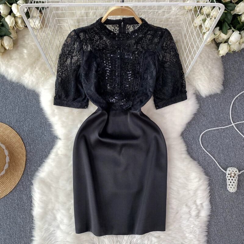 フレンチレーススプライシング重工業ビーズドレス気質スリムウエストとハイエンド女神ファンパフスリーブスカート lyxaj63937375536