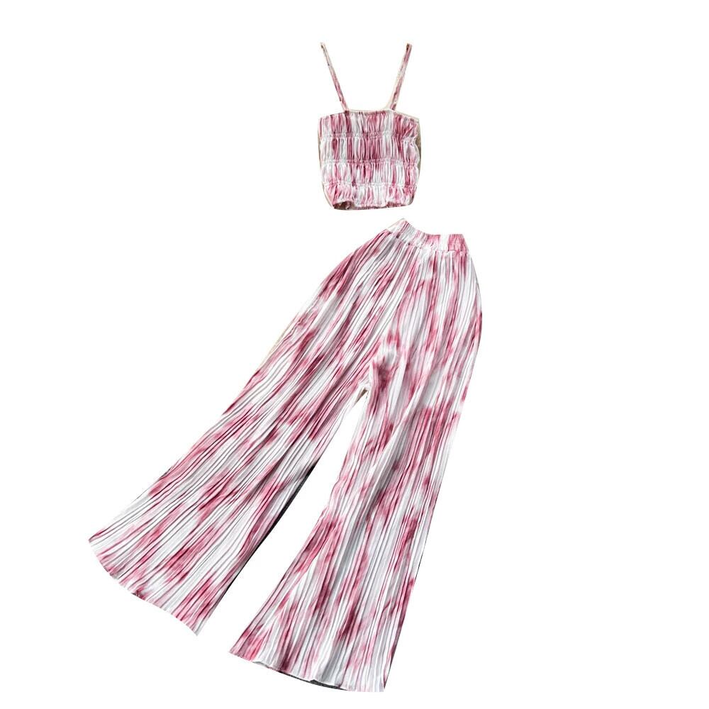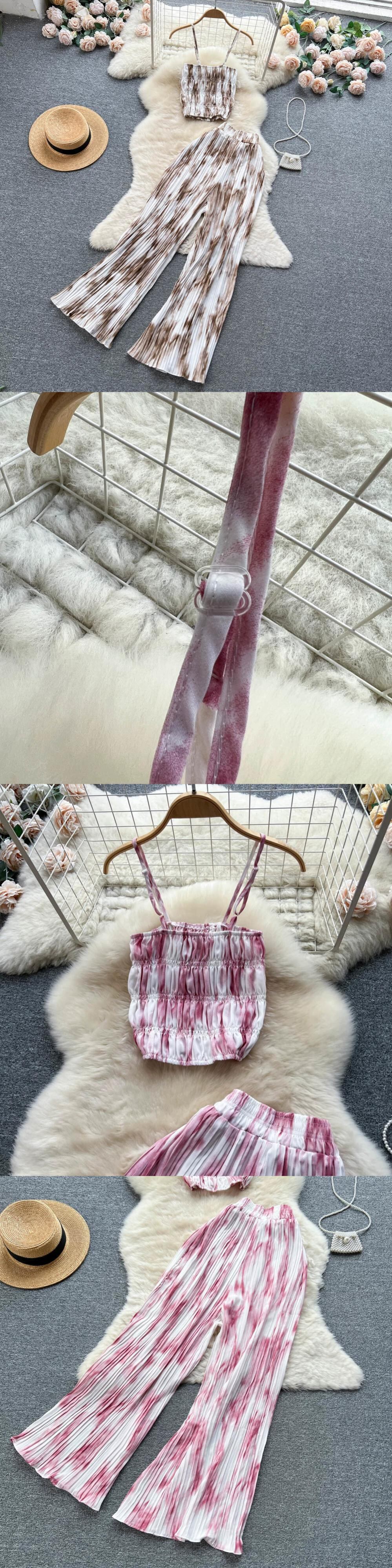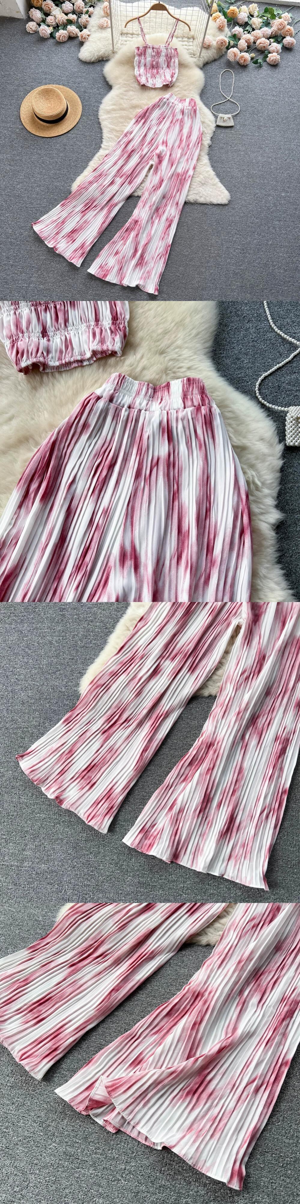 夏の新しい海辺の休暇スーツ弾性ウエストワイドレッグパンツスリムフィットチューブトップサスペンダーファッションタイダイツーピースセット エラスティック 伸縮 サマー 夏物 lyxaj4819143636