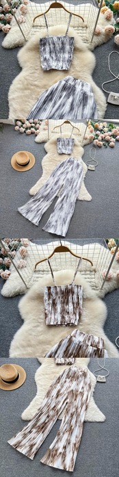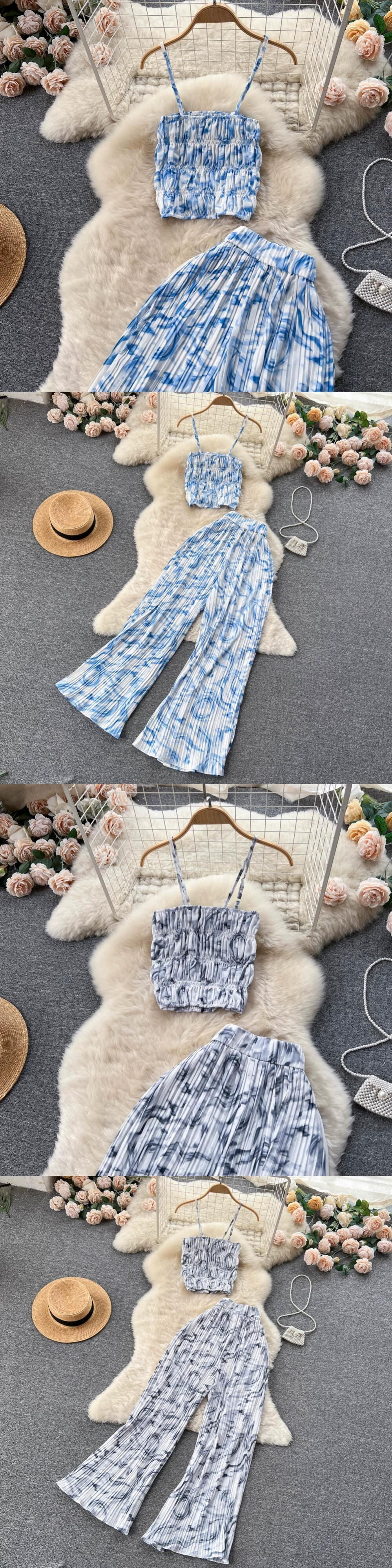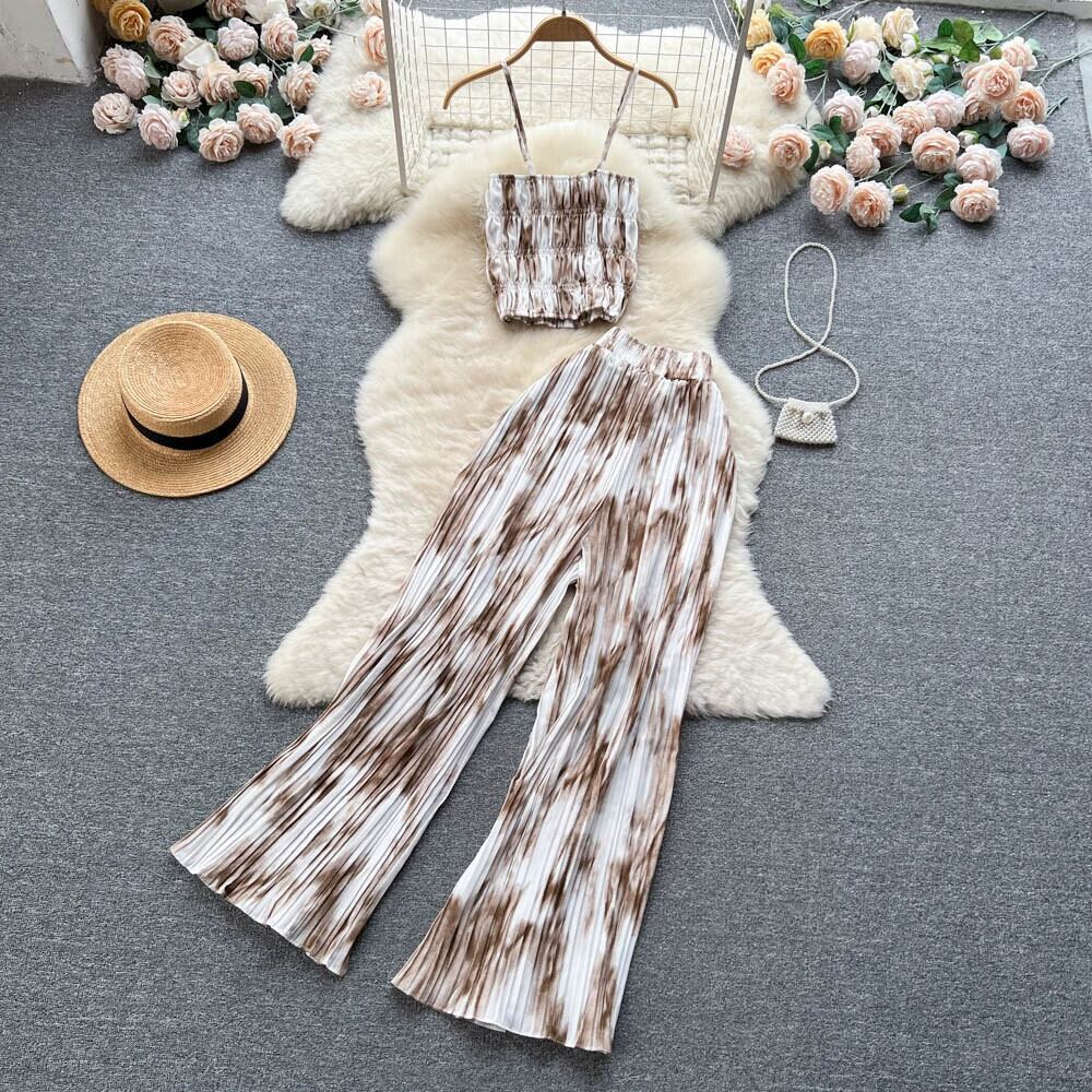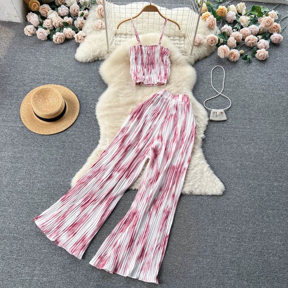 夏の新しい海辺の休暇スーツ弾性ウエストワイドレッグパンツスリムフィットチューブトップサスペンダーファッションタイダイツーピースセット エラスティック 伸縮 サマー 夏物 lyxaj4819143636