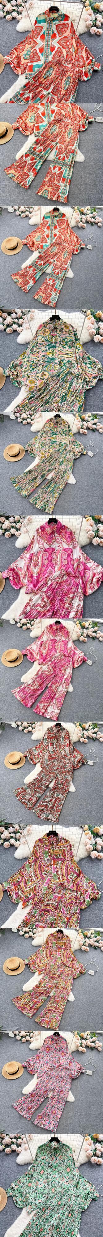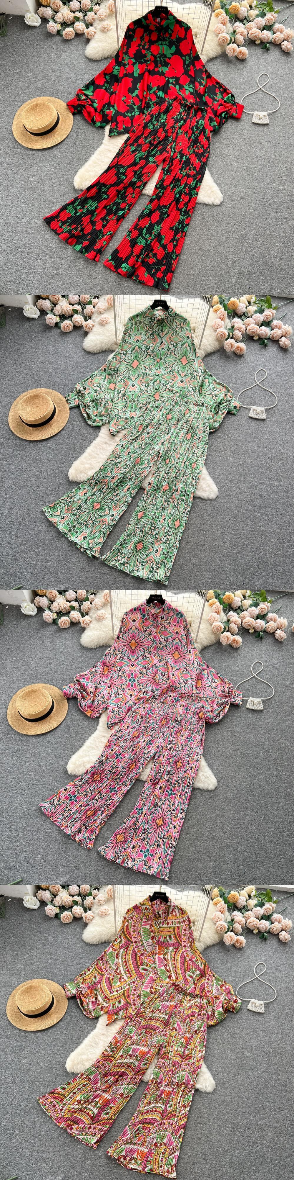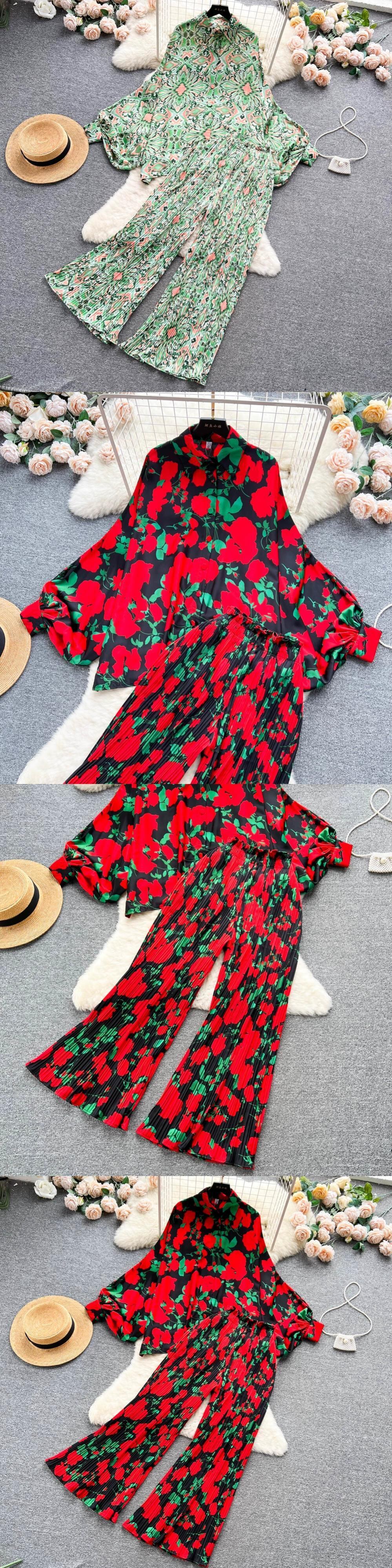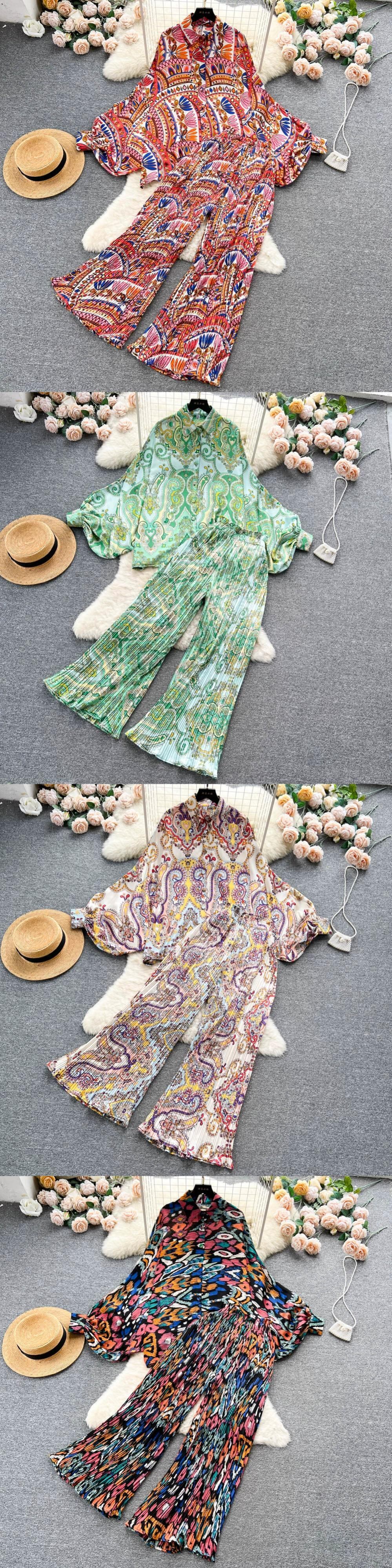 ヨーロッパとアメリカのファッションプリントスーツの女性のルーズランタンスリーブラペルシャツカジュアルハイウエストプリーツワイドレッグパンツ2点セット ハイウェスト ヨーロピアン lyxaj35730256812