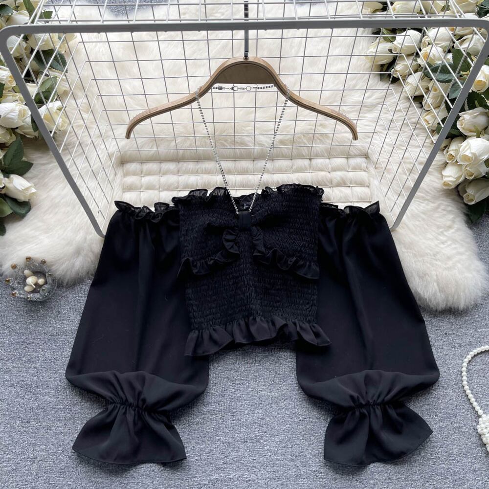ワンショルダー チェーン サスペンダー チューブトップ シフォン トップ 女性 スリム ショート フレンチ デザイン センス ニッチ パフ スリーブ シャツ lyxaj14121530932