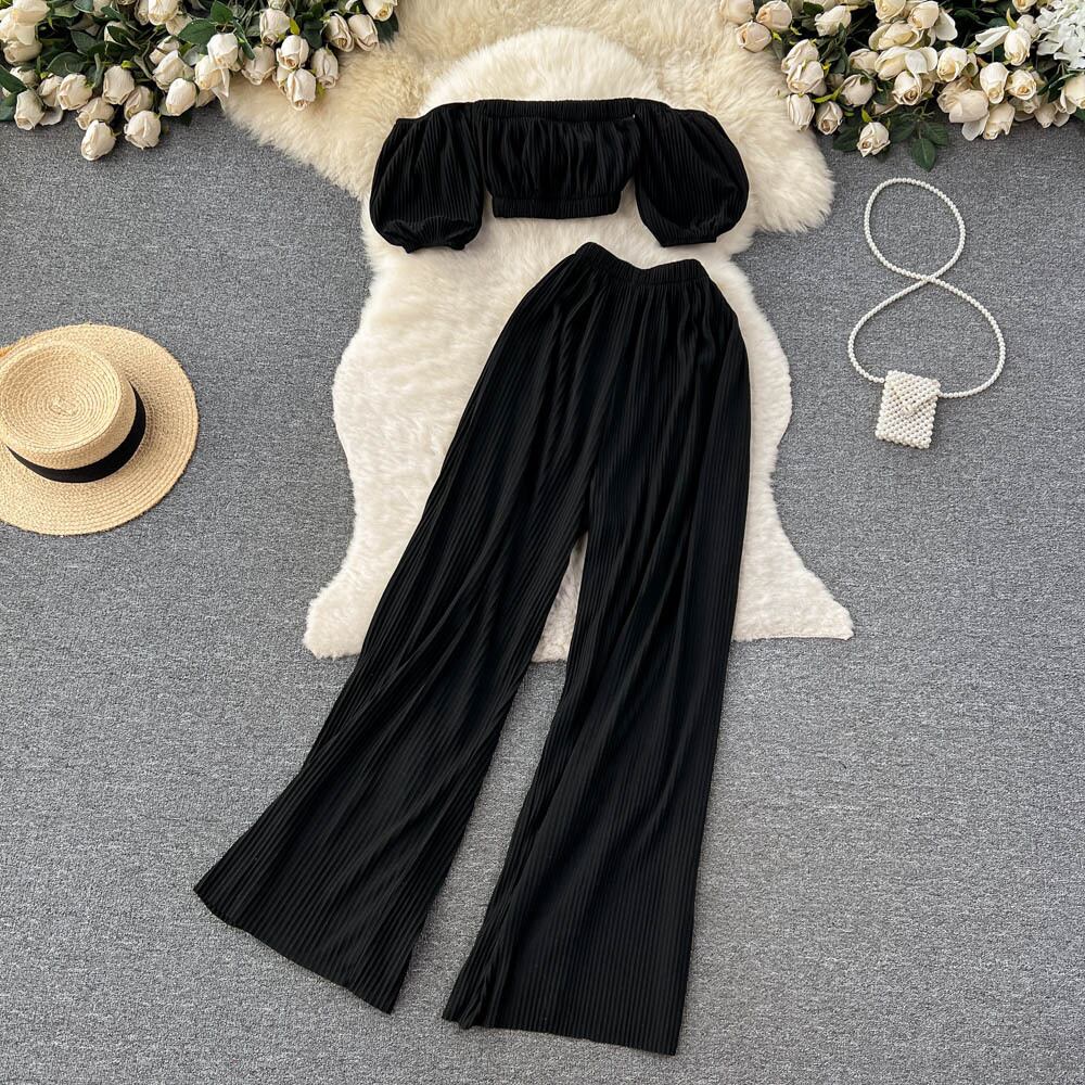 セクシーなパフスリーブチューブトップファッションスーツ女性の夏のハイウエストカジュアルプリーツワイドレッグパンツツーピーストレンディ ハイウェスト サマー 夏物 lyxaj24990689127