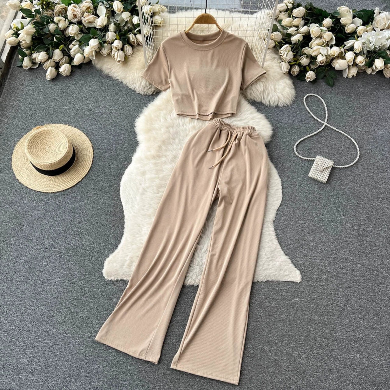 夏のシンプルなスタイルの無地半袖 Tシャツトップ弾性ウエストスリムワイドレッグパンツカジュアルツーピーススーツ女性 エラスティック 伸縮 サマー 夏物 ソリッドカラー lyxaj69665417008