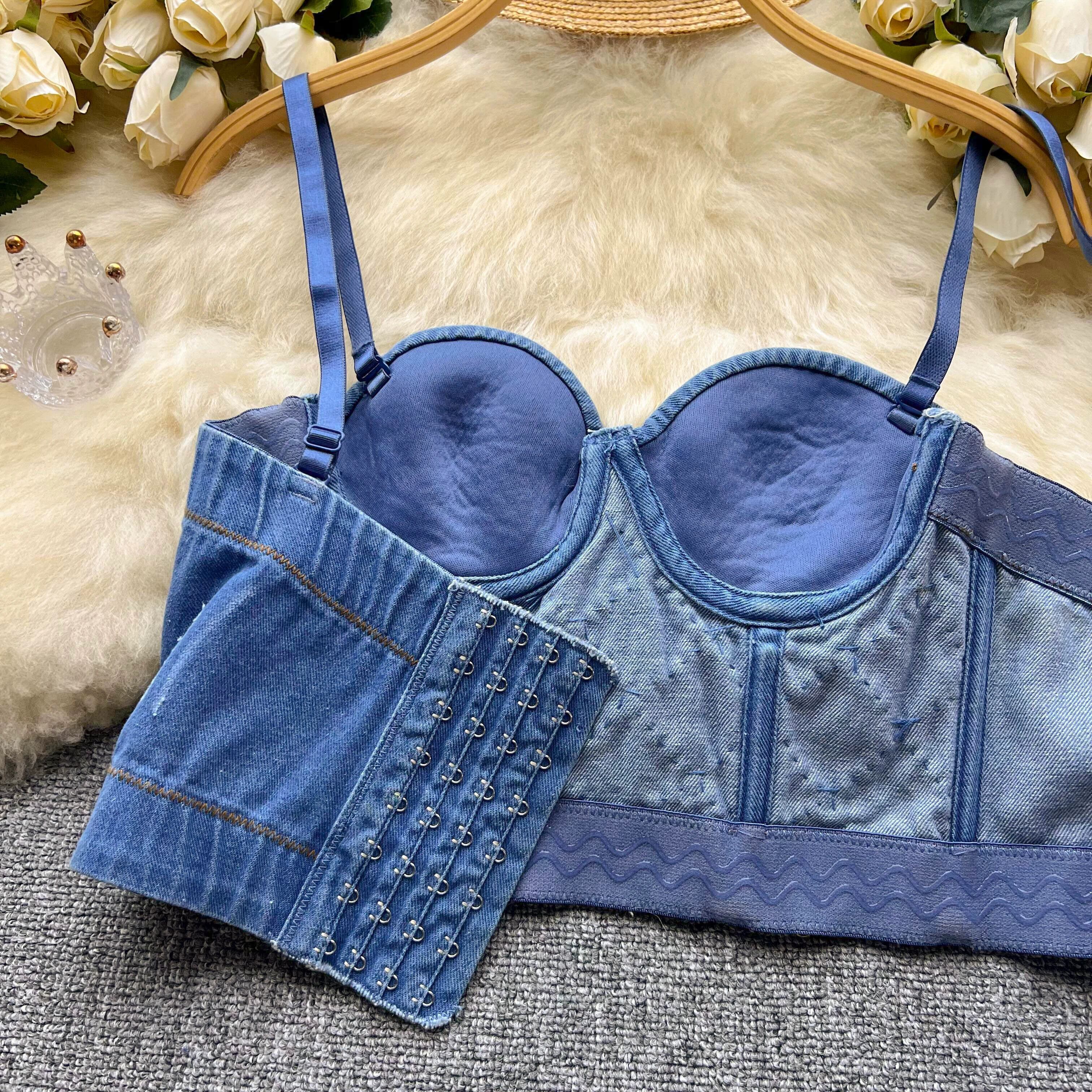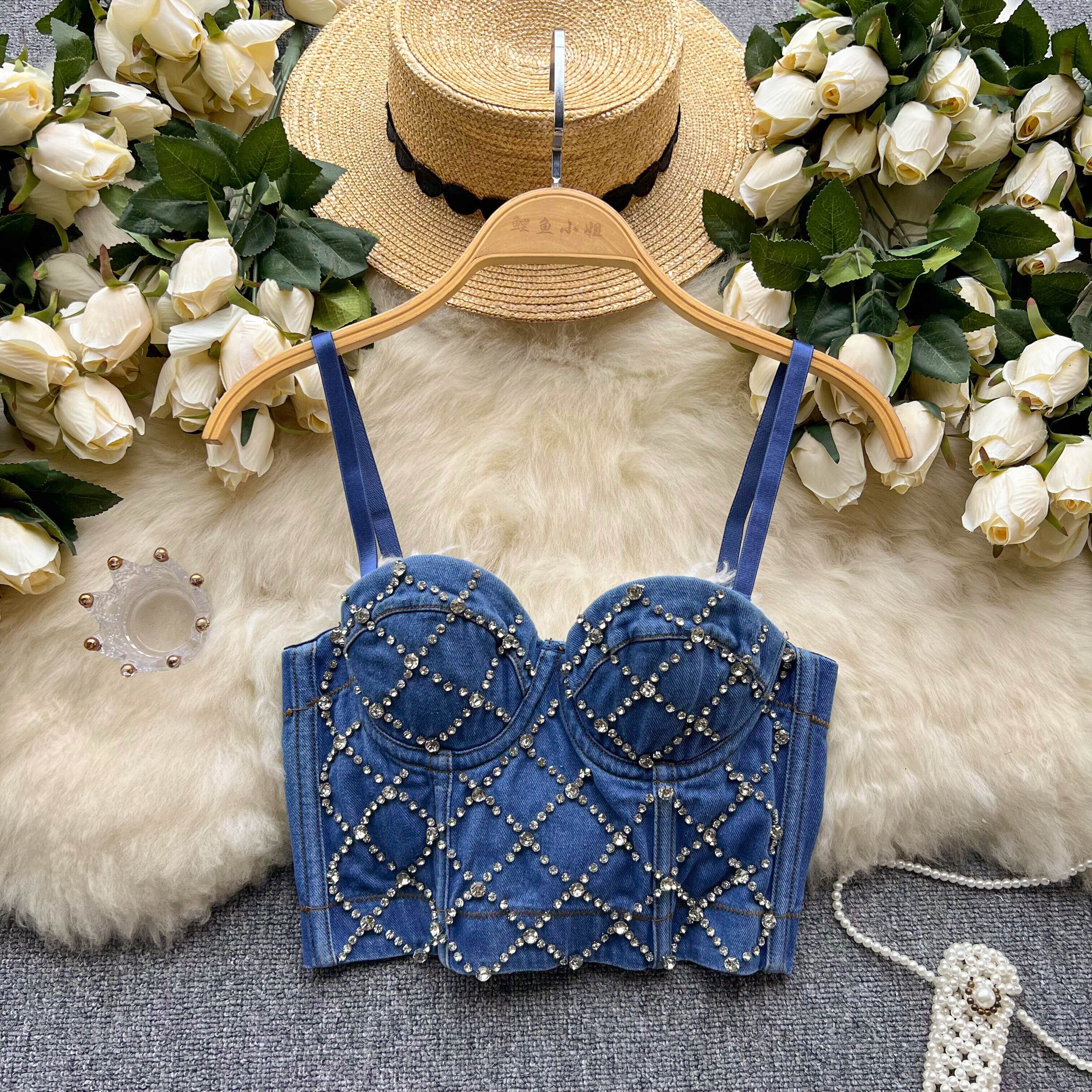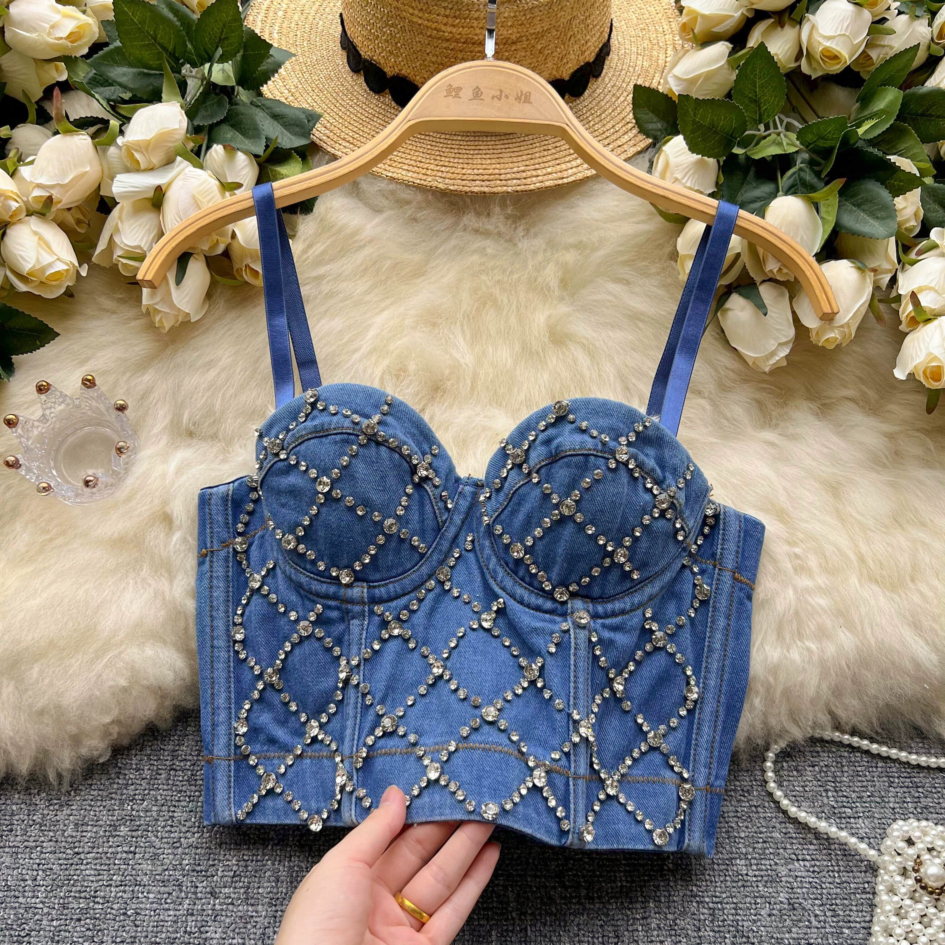 重工業ビーズダイヤモンドキャミソールフェミニンショートアウター胸パッド付きスリムフィットコルセットラップ胸デニムトップ lyxaj87268071202