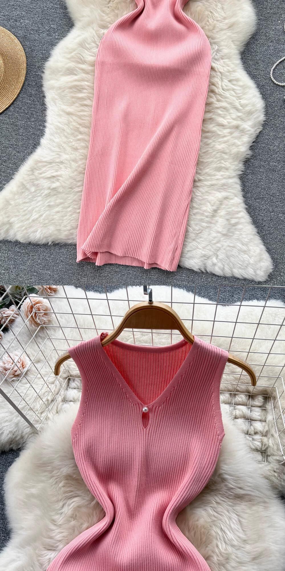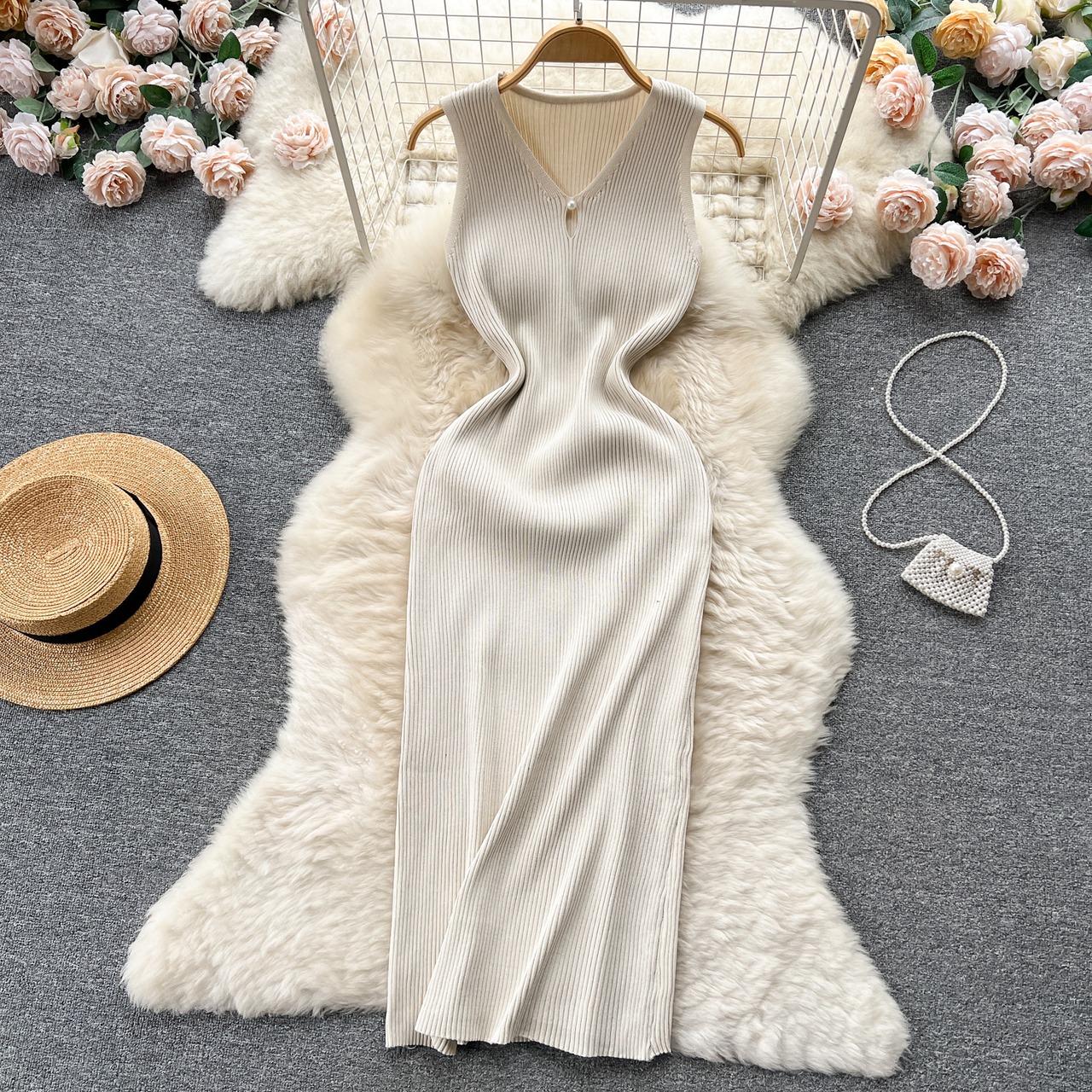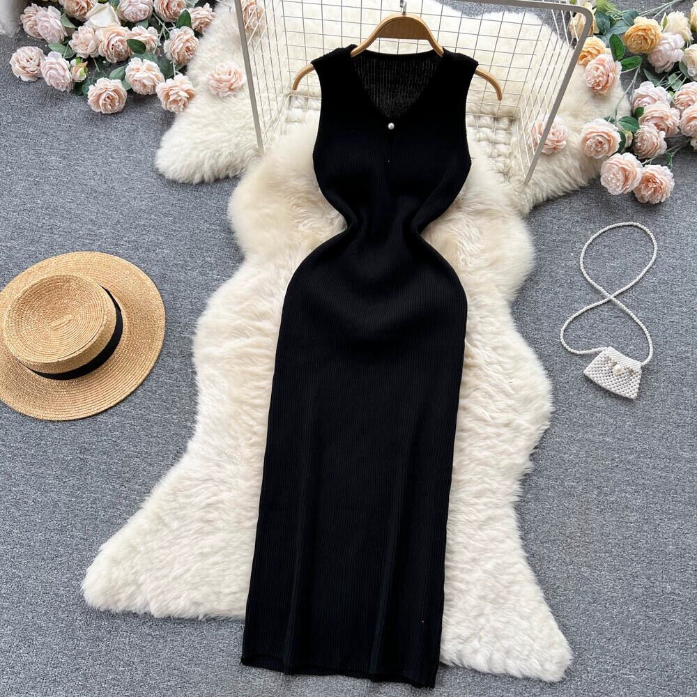 夏の新しいシンプルなデザインのソリッドカラーのニットドレスの女性のベストスカートノースリーブ底膝バッグヒップスカートの上 サマー 夏物 lyxaj25199977442