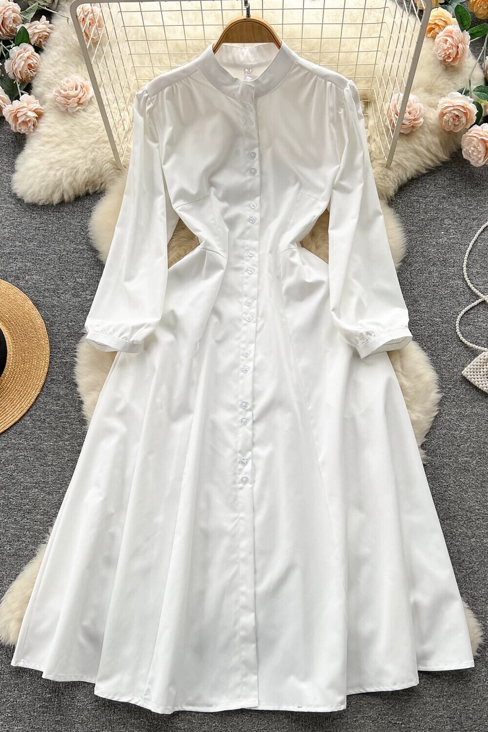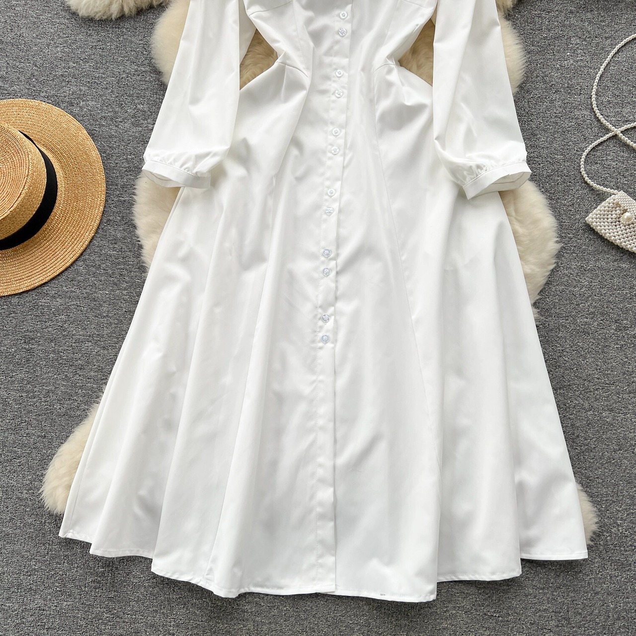 -エンドパフスリーブ長袖シャツ白ワンピースレディース春夏ラウンドネック無地ウエストデザインロングスカート ホワイト スプリング 春物 サマー 夏物 Oネック ソリッドカラー lyxaj50426886815
