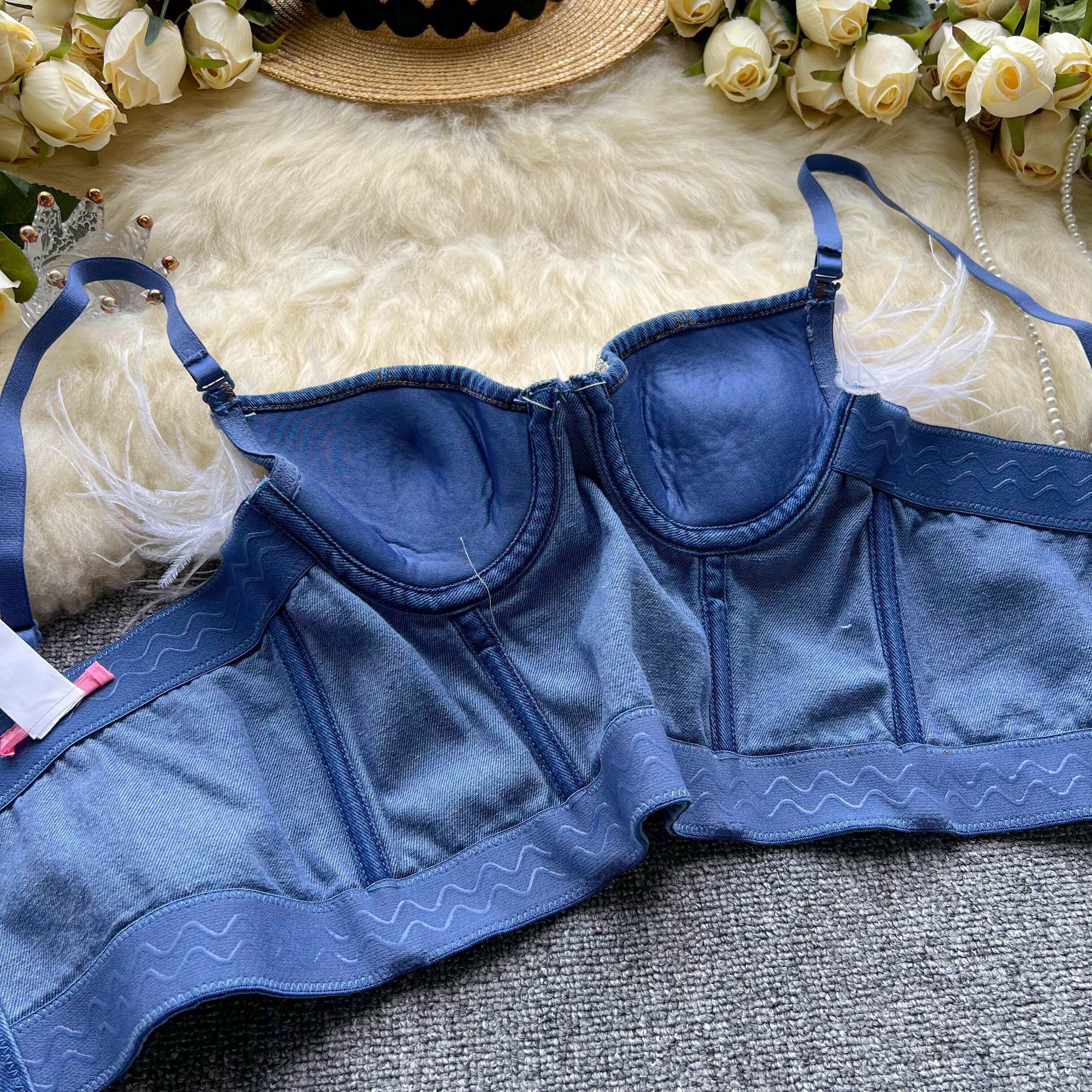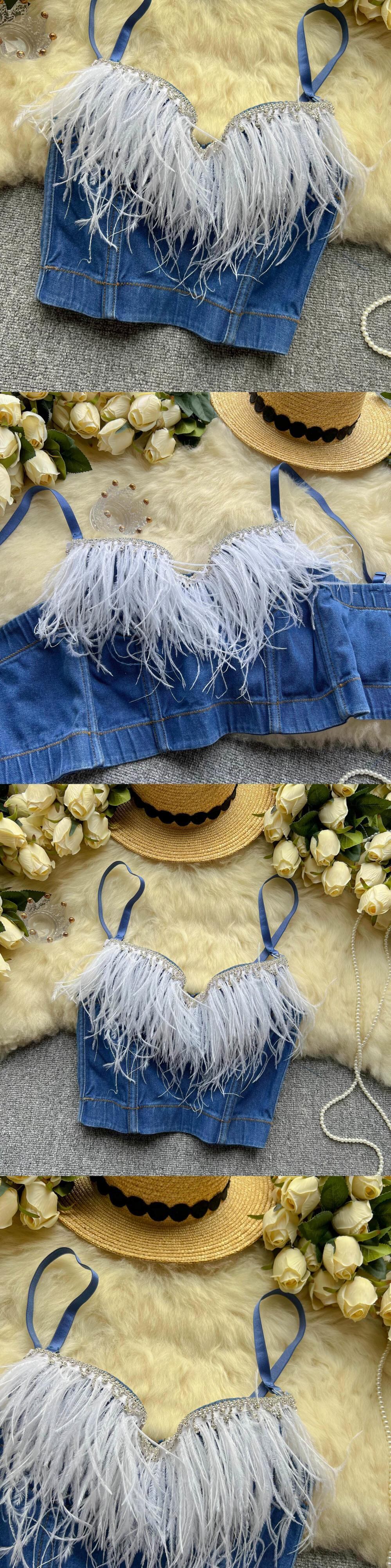 アメリカンレトロなデザインセンスダイヤモンドフェザーテルチューブトップキャミソール女性の夏のアウターオールマッチデニムトップ サマー 夏物 lyxaj18377835857