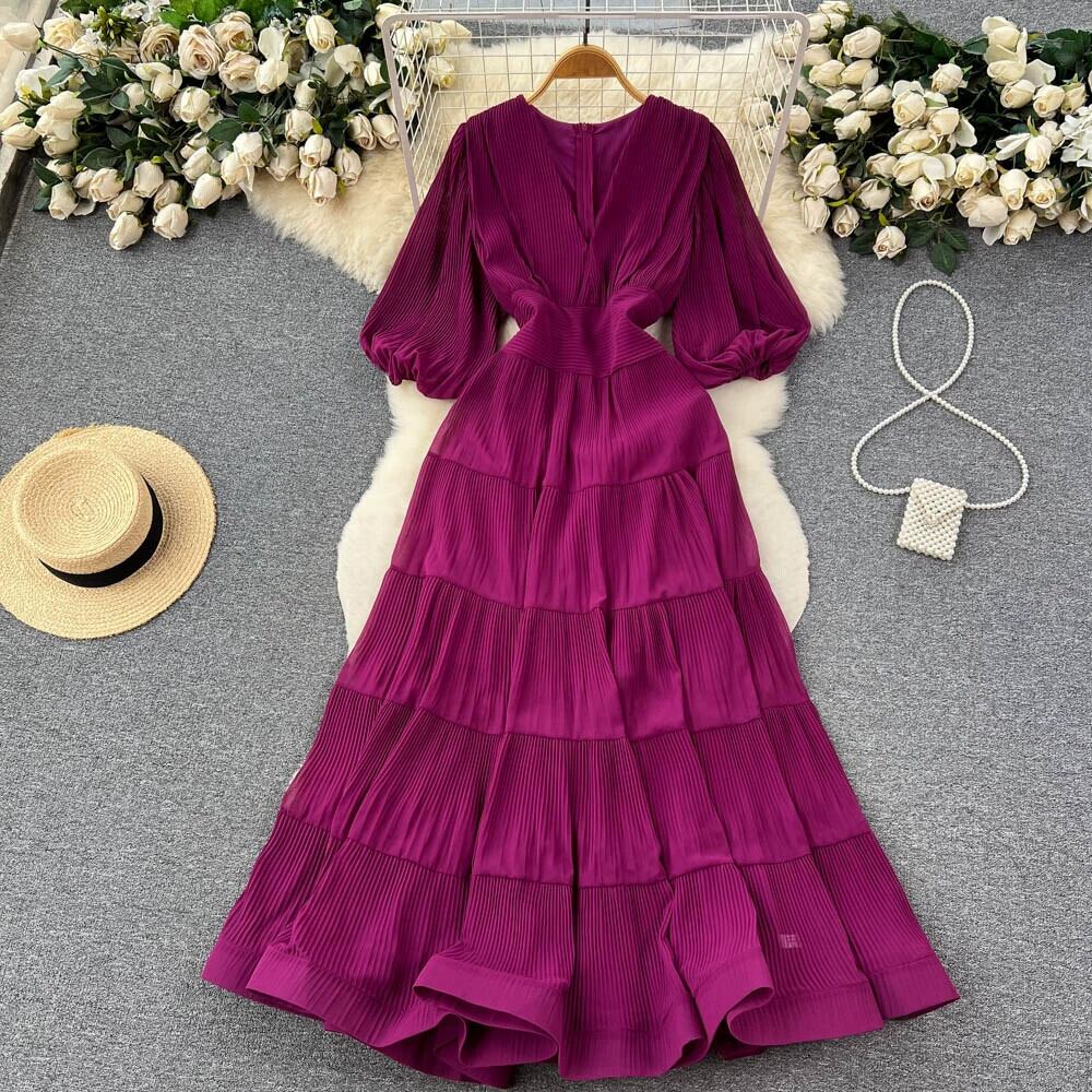 フレンチレトロプリーツ V ネックドレス女性の夏のパフスリーブフリルウエスト痩身優しい甘いビッグスイングスカート 大人ガーリー スウィート キュート カジュアル サマー 夏物 Vネック lyxaj83655120331
