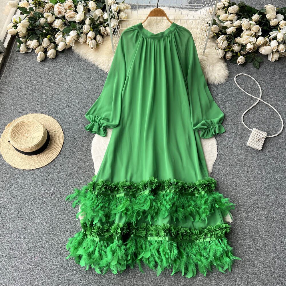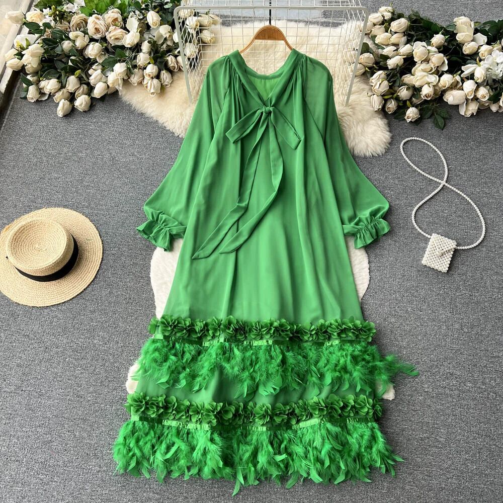 フレンチスタイルのハイエンド長袖ドレス女性ニッチデザインゆるくて薄い重工業フェザーテルシックロングスカート lyxaj29977513762