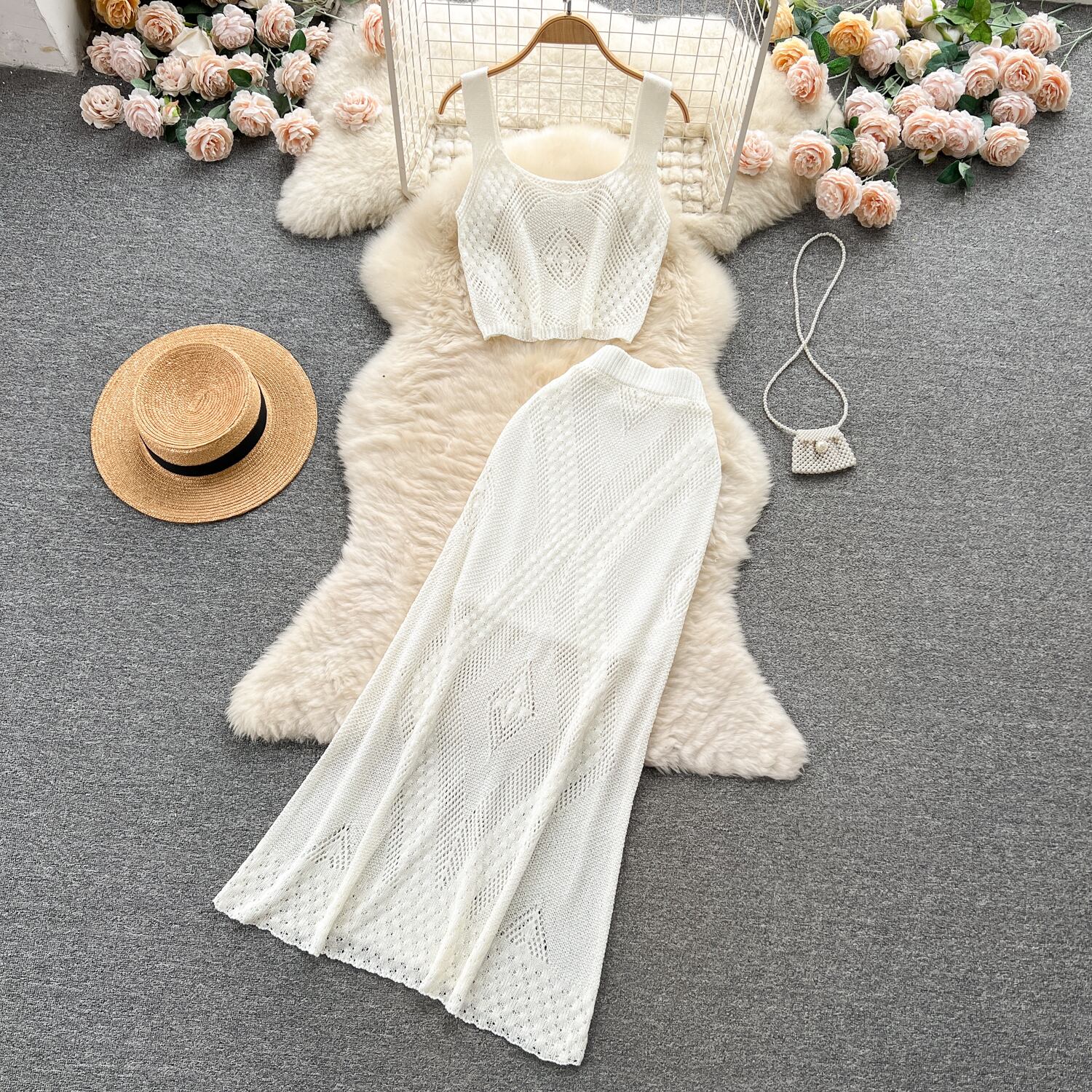 ニットスーツの女性の夏の新しいニッチ中空ジャカードキャミソールバッグヒップハイウエストロングスカート 2 点セット ハイウェスト サマー 夏物 lyxaj49699736341