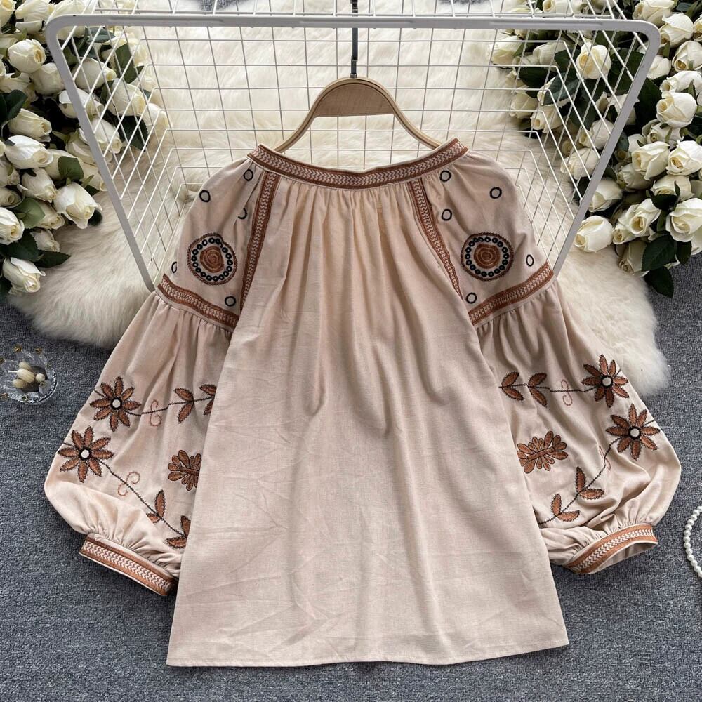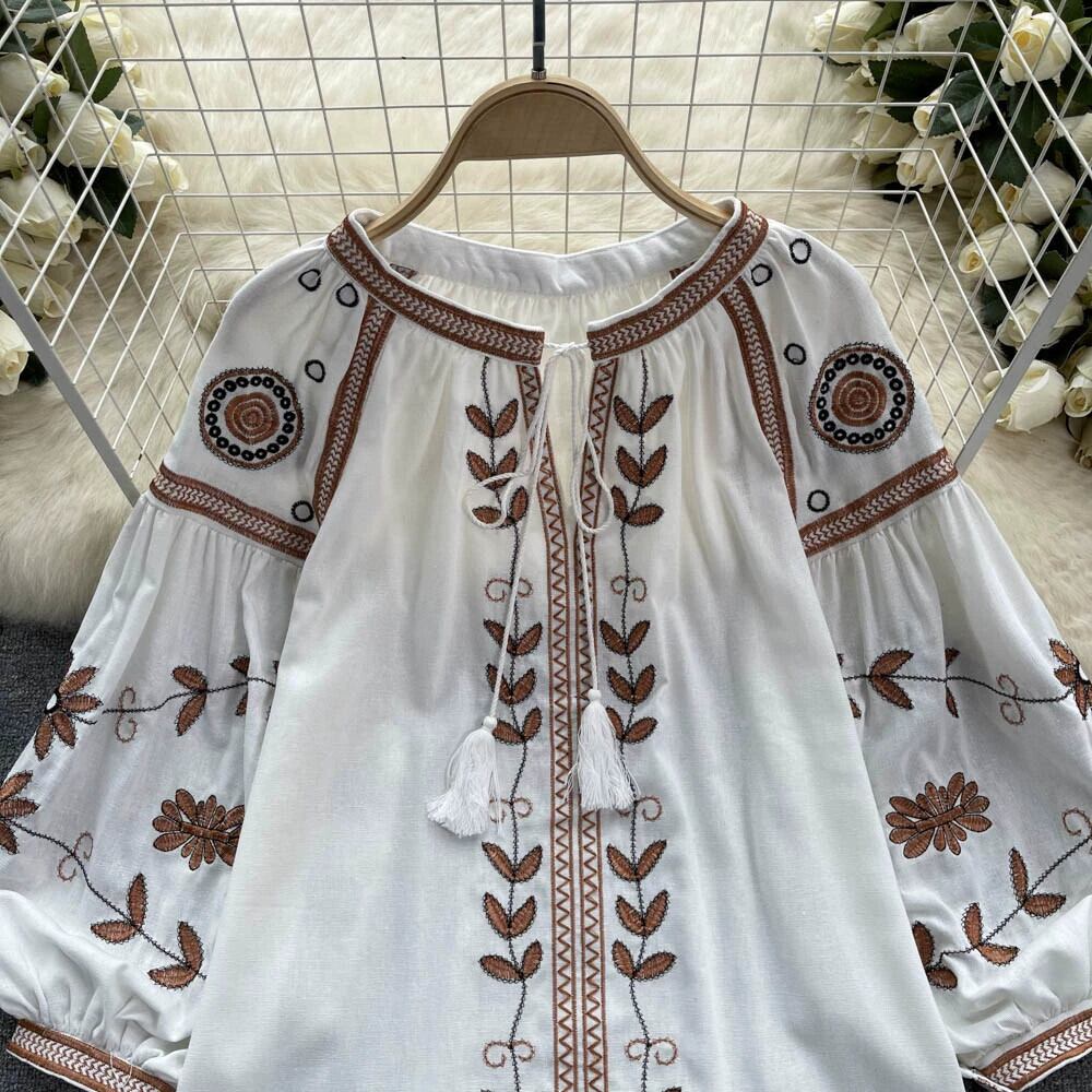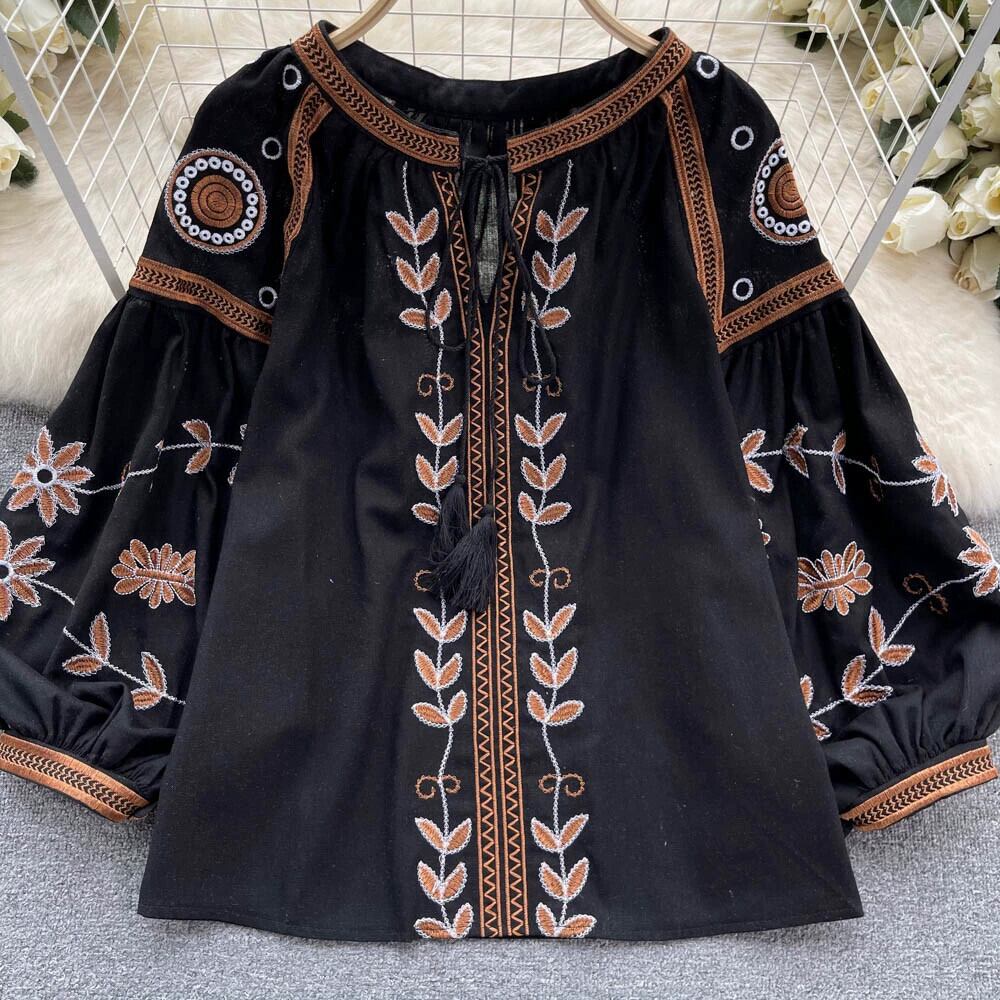 重工業刺繍シャツエスニックスタイル刺繍電話長袖ルーズネクタイラウンドネックパフスリーブトップ女性 ロング レッド Oネック lyxaj74711299633