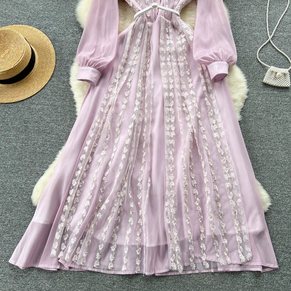 フランスの気質、高級メッシュステッチシフォンドレス、スリムウエスト、ラペル、長袖ドレス、長袖ドレス ロング lyxaj68020139417