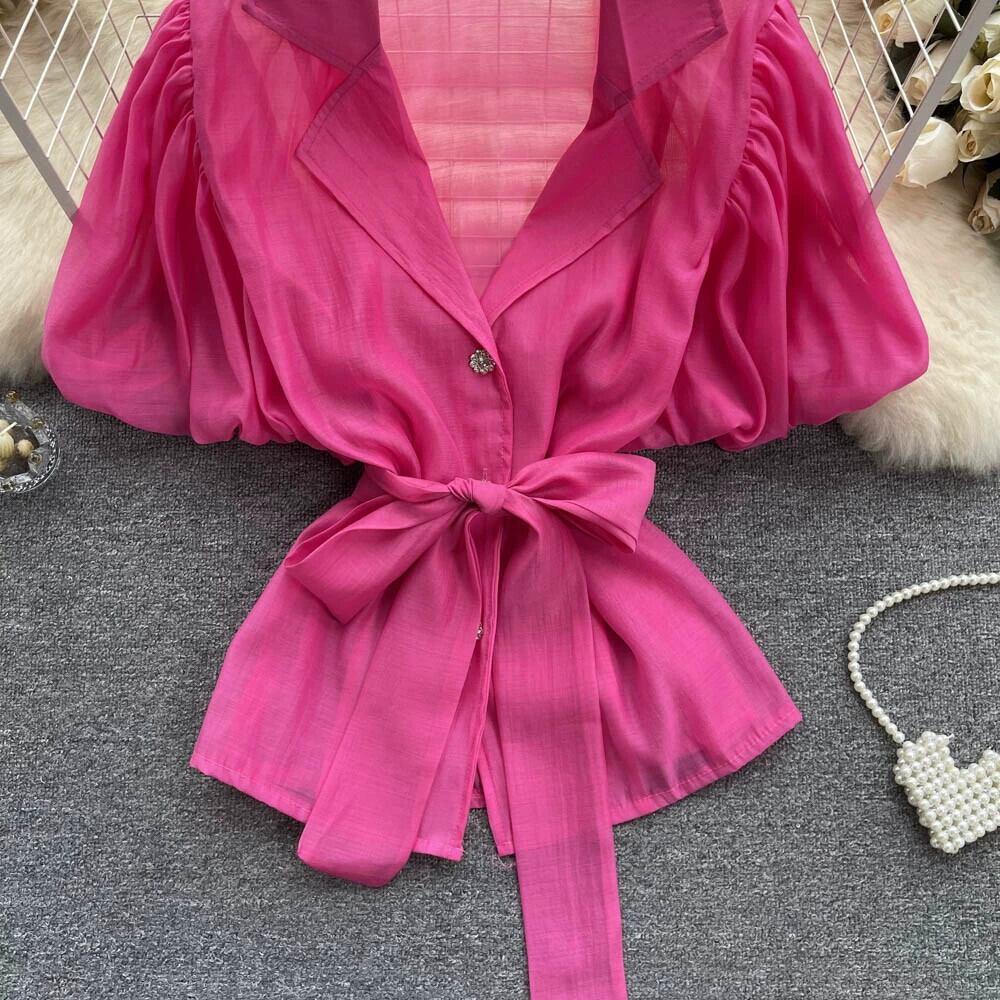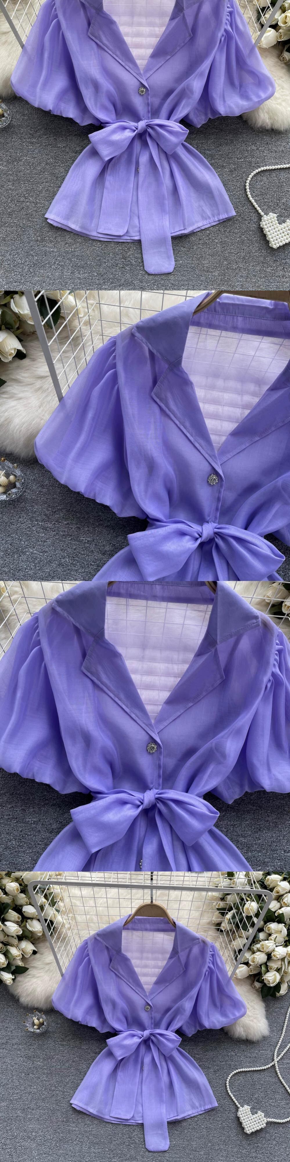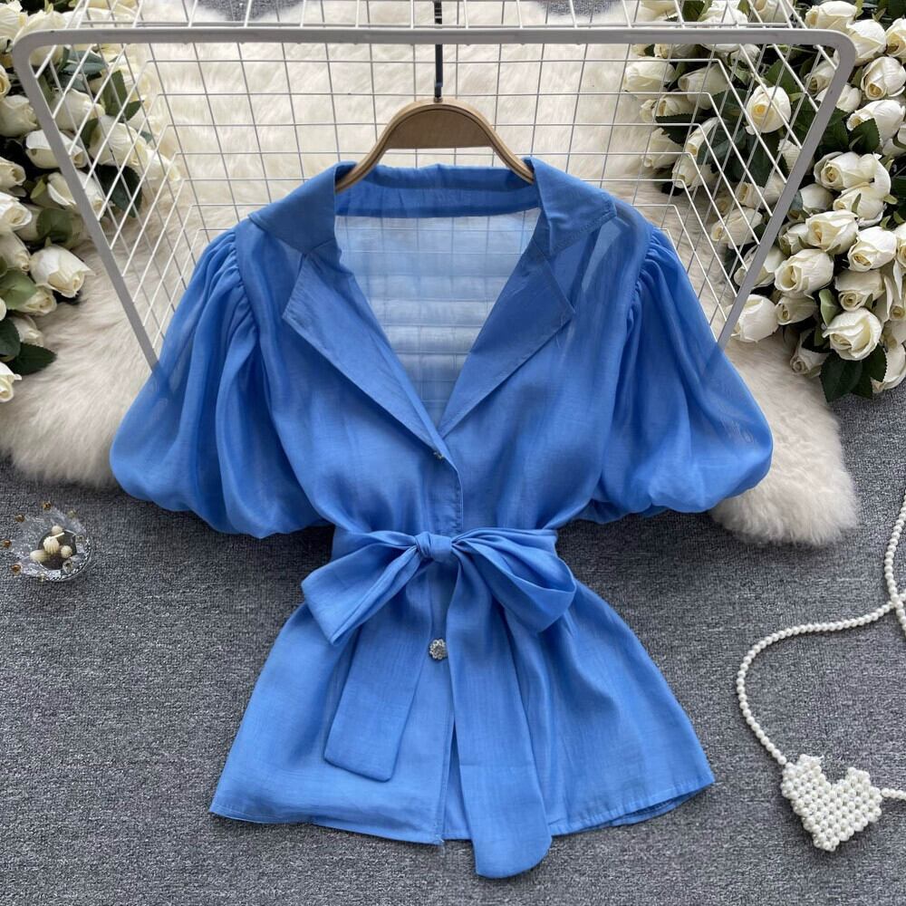 無地ラペルパフスリーブ日焼け止め服夏デザインセンスニッチメッシュシースルーシフォンシャツ空調シャツトップ付き サマー 夏物 ソリッドカラー lyxaj10535393002