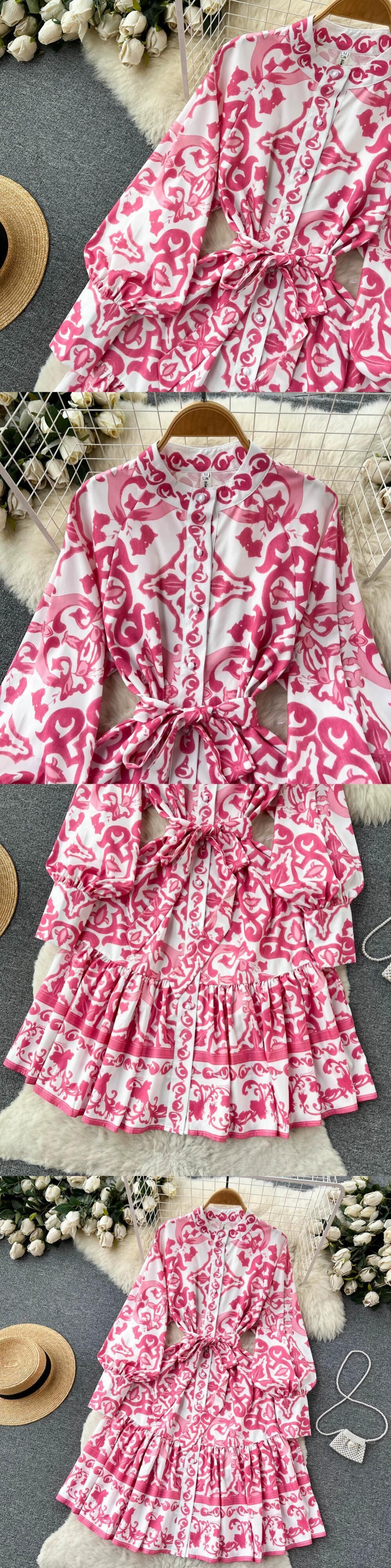 フランス長袖シングルブレストフリルプリントドレス女性のウエスト痩身気質レトロハイエンドショートスカート ロング ラッフル lyxaj84095625898