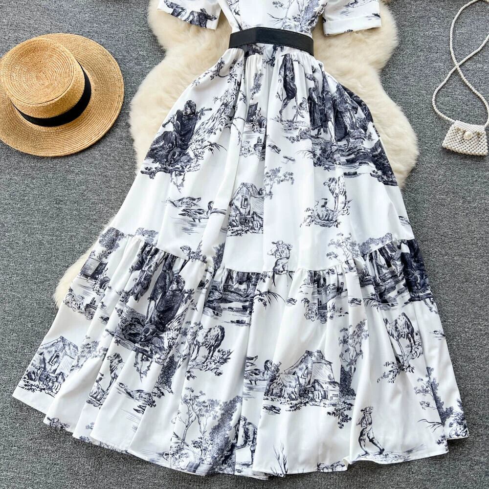 フランスの宮廷スタイルのポロカラードレスの女性の夏のインクプリントウエストライト高級ハイレベルニッチ気質スカート サマー 夏物 lyxaj86714816456