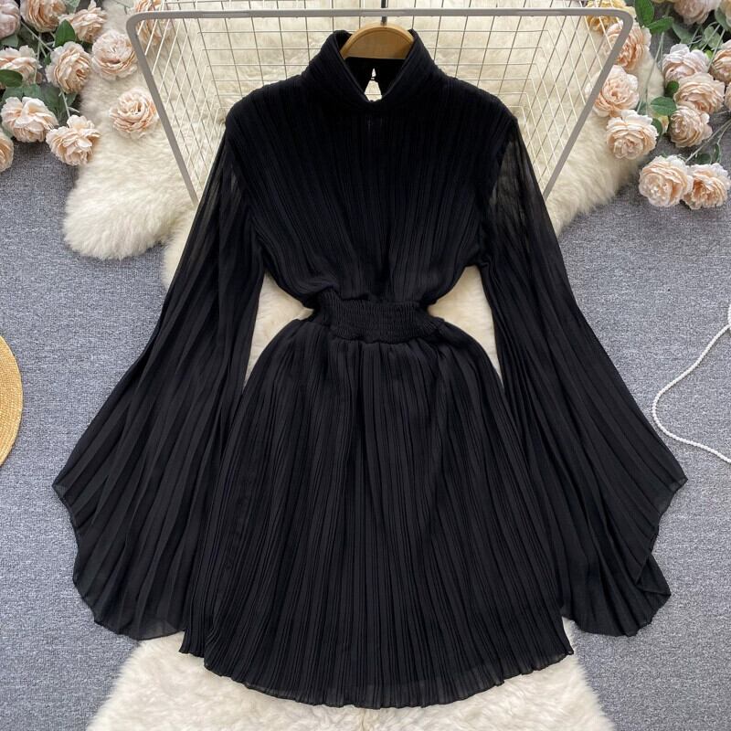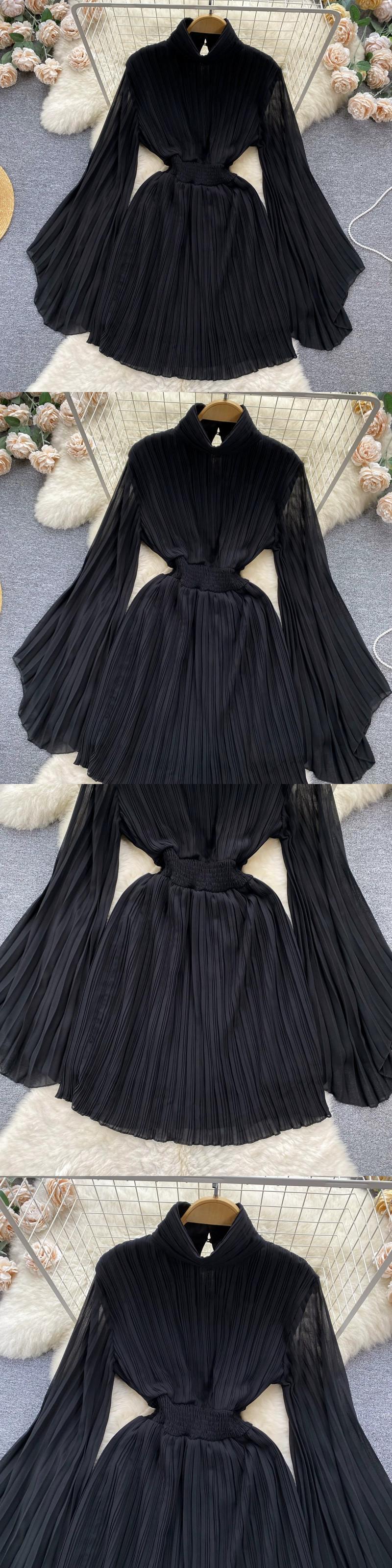 -エンドプリーツトランペットスリーブハイネックドレスレディース春夏フレンチライトラグジュアリーニッチデザインセンスウエストシフォンスカート スプリング 春物 サマー 夏物 lyxaj25603977574