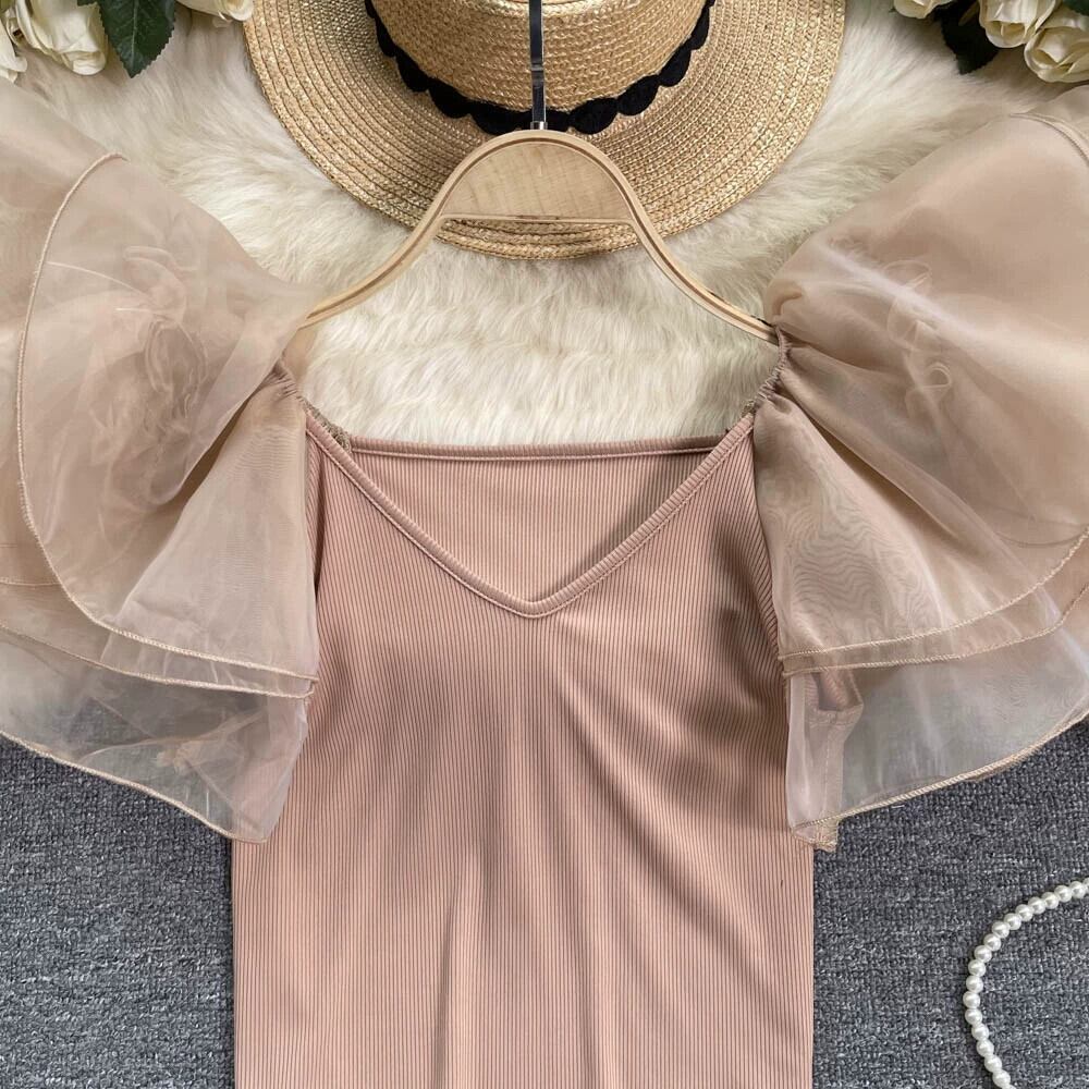 ヨーロッパとアメリカンスタイルのニッチオーガンザ花びらスリーブシャツ女性の弾性スリムスリムアインスタイルTシャツ多目的シックトップ エラスティック 伸縮 ヨーロピアン lyxaj60997881383