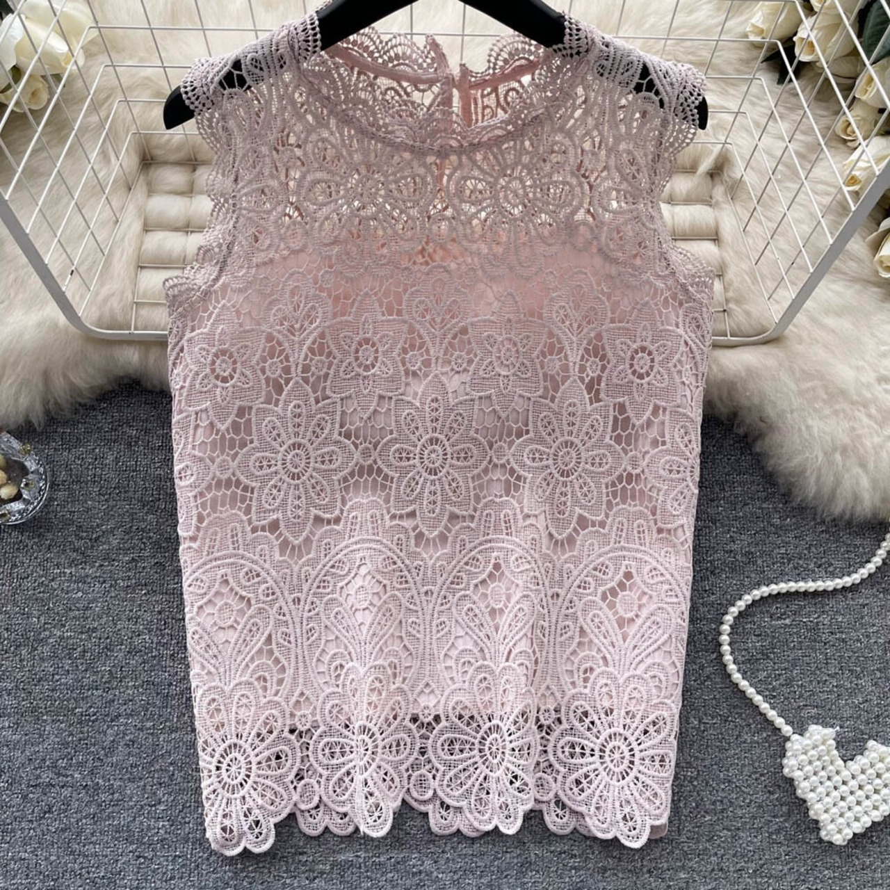 夏の新レトロレース中空フックフラワーラウンドネックトップ女性のオールマッチ痩身気質底シャツノースリーブベスト サマー 夏物 Oネック フラワーデザイン lyxaj79619759426