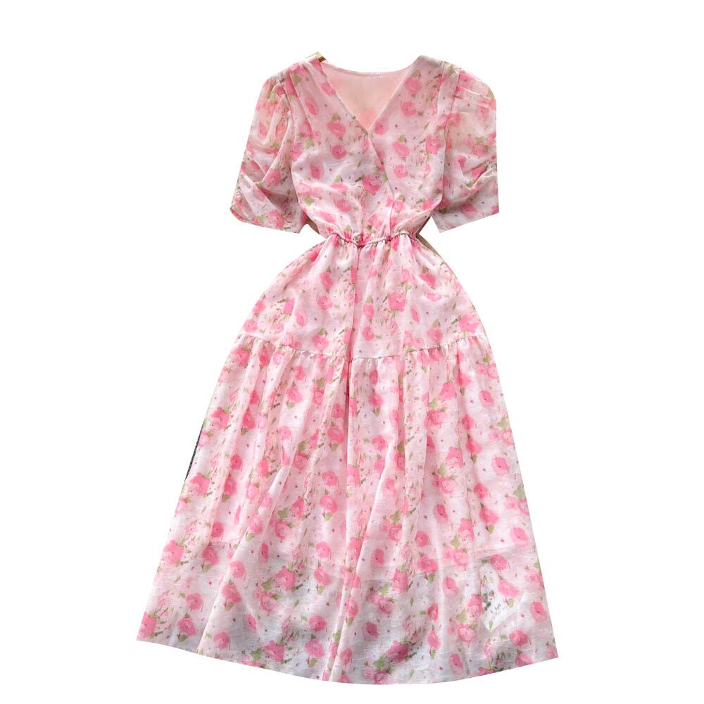 フレンチシックな優しい風の花柄ドレス女性の夏のスリムな気質プリーツパフスリーブウエスト妖精ドレス サマー 夏物 lyxaj78564318605