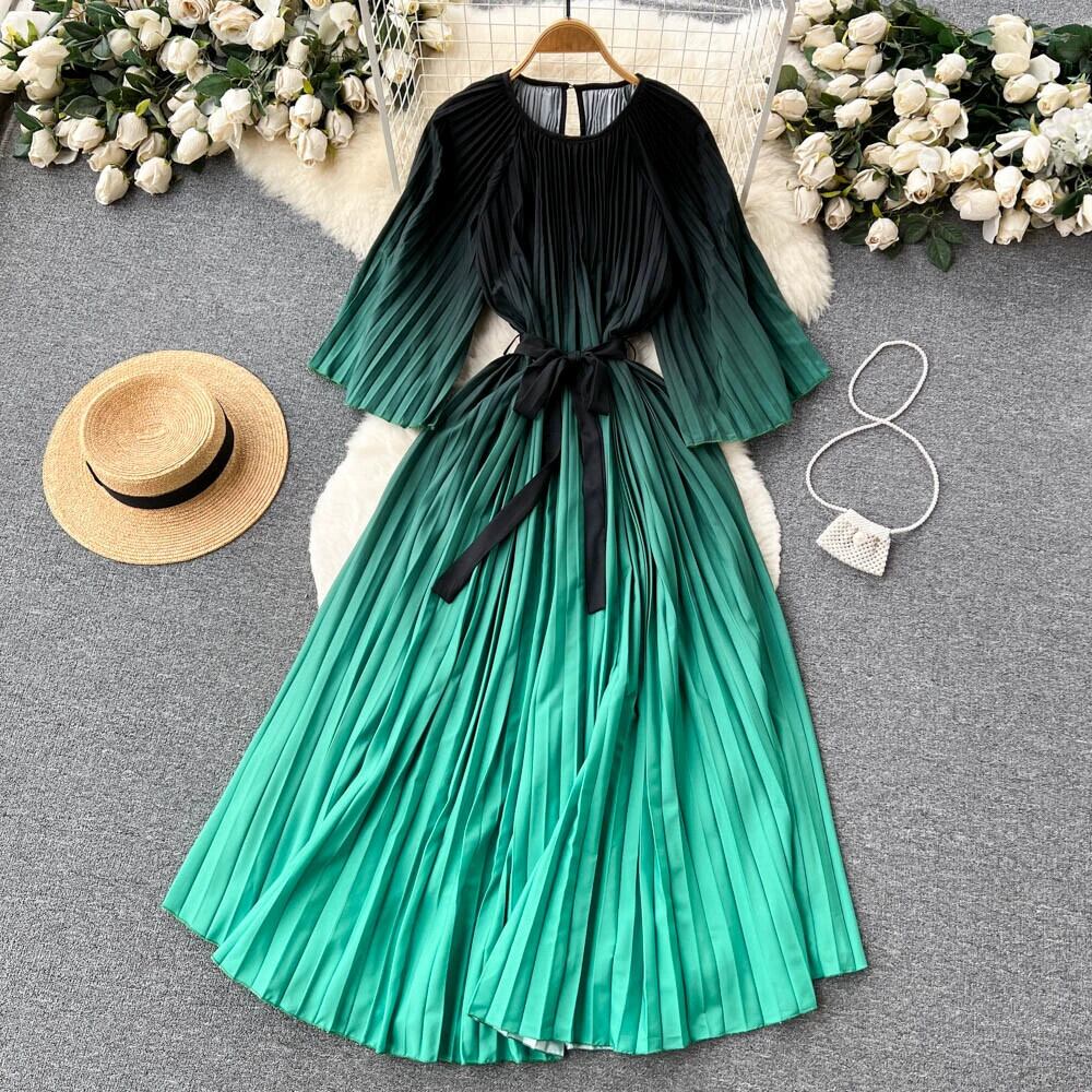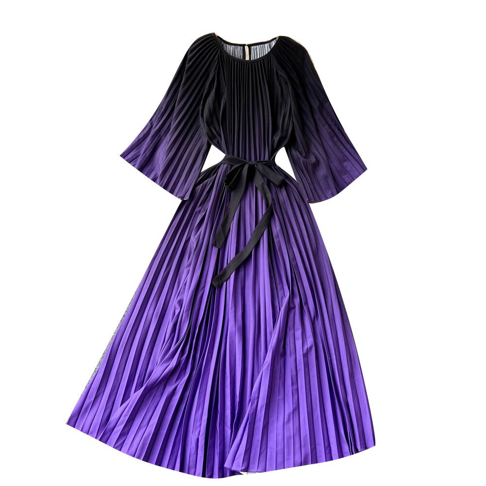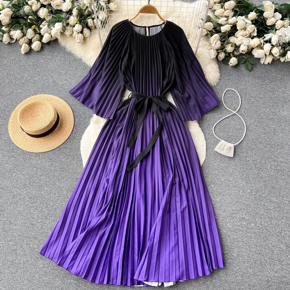 レトロな気質、高級で美しいドレス、女性のニッチなデザイン、プリーツのトランペットスリーブ、ウエストの緩いプリーツスカート lyxaj22226006001