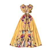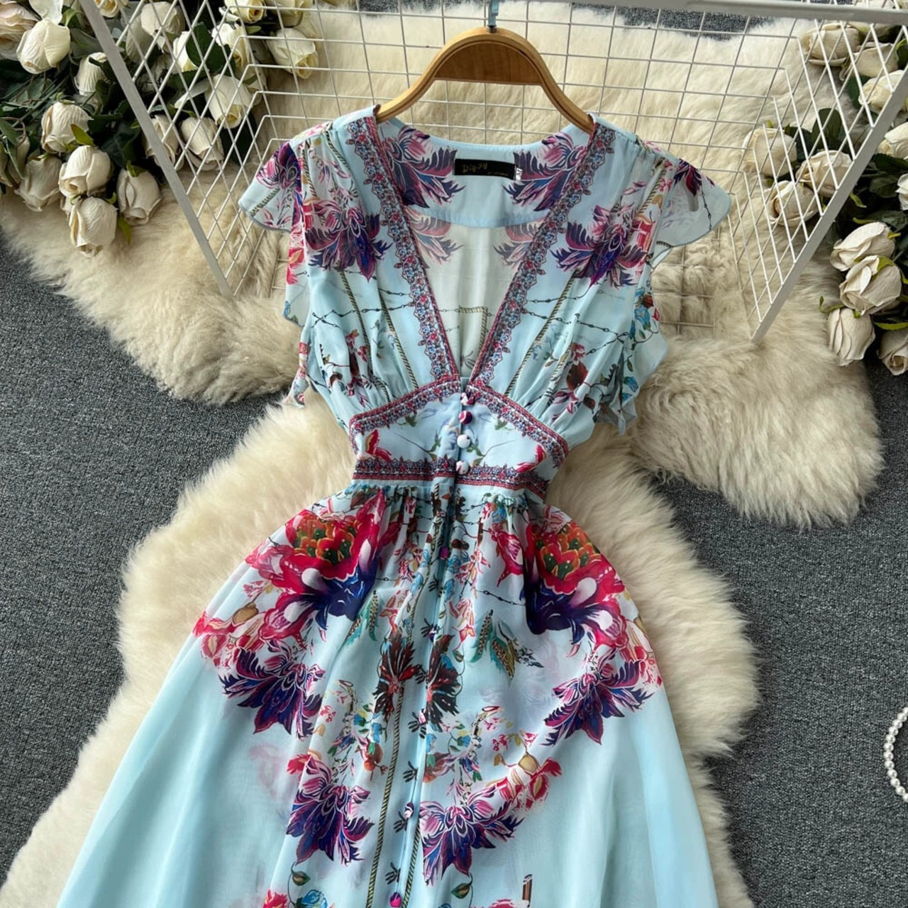 レトロなコートスタイルのシフォンプリントドレスレディースサマードレススリムウエストとフリル袖薄くて深いVネックロングスカート 夏物 lyxaj57584917003