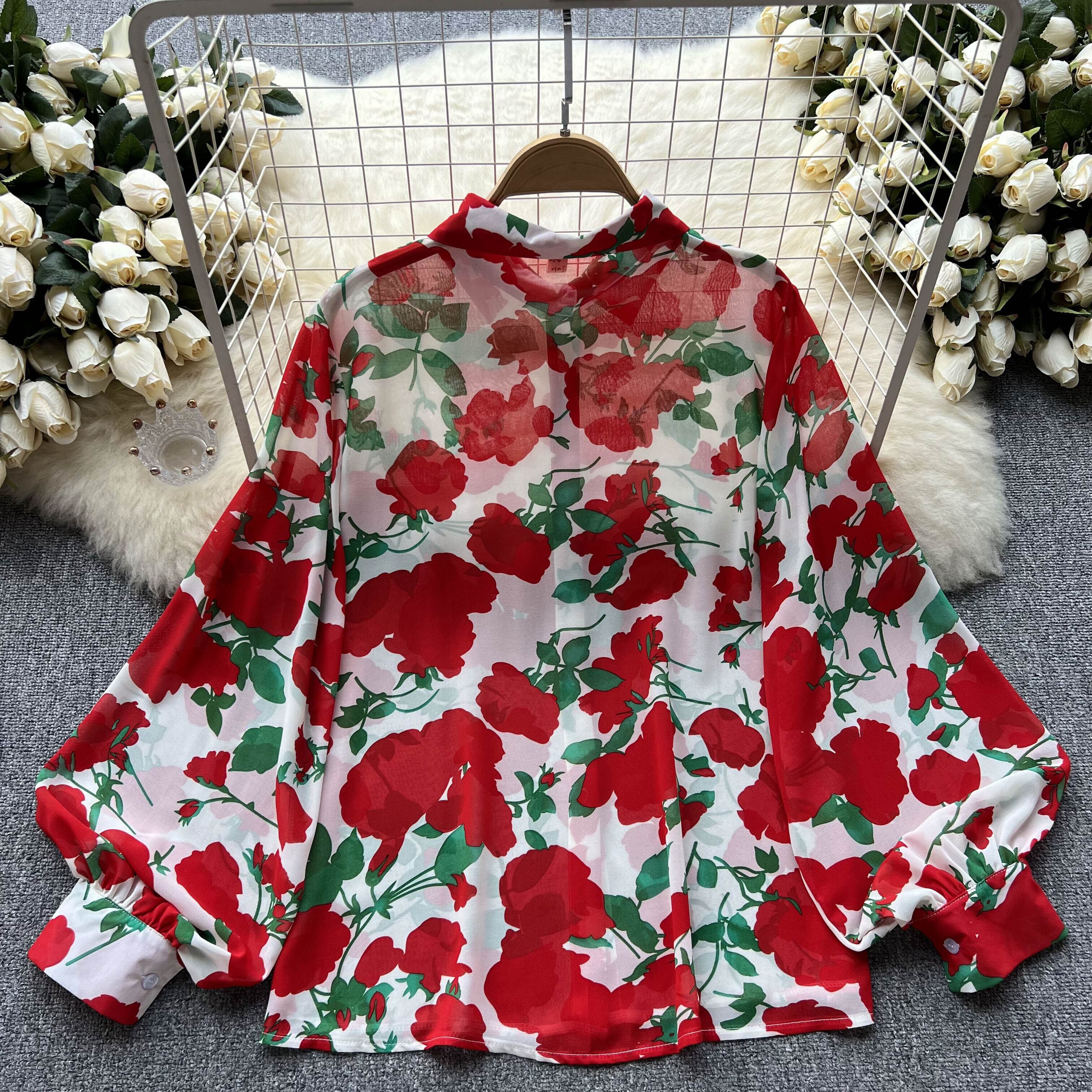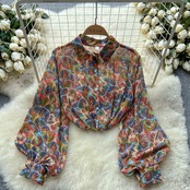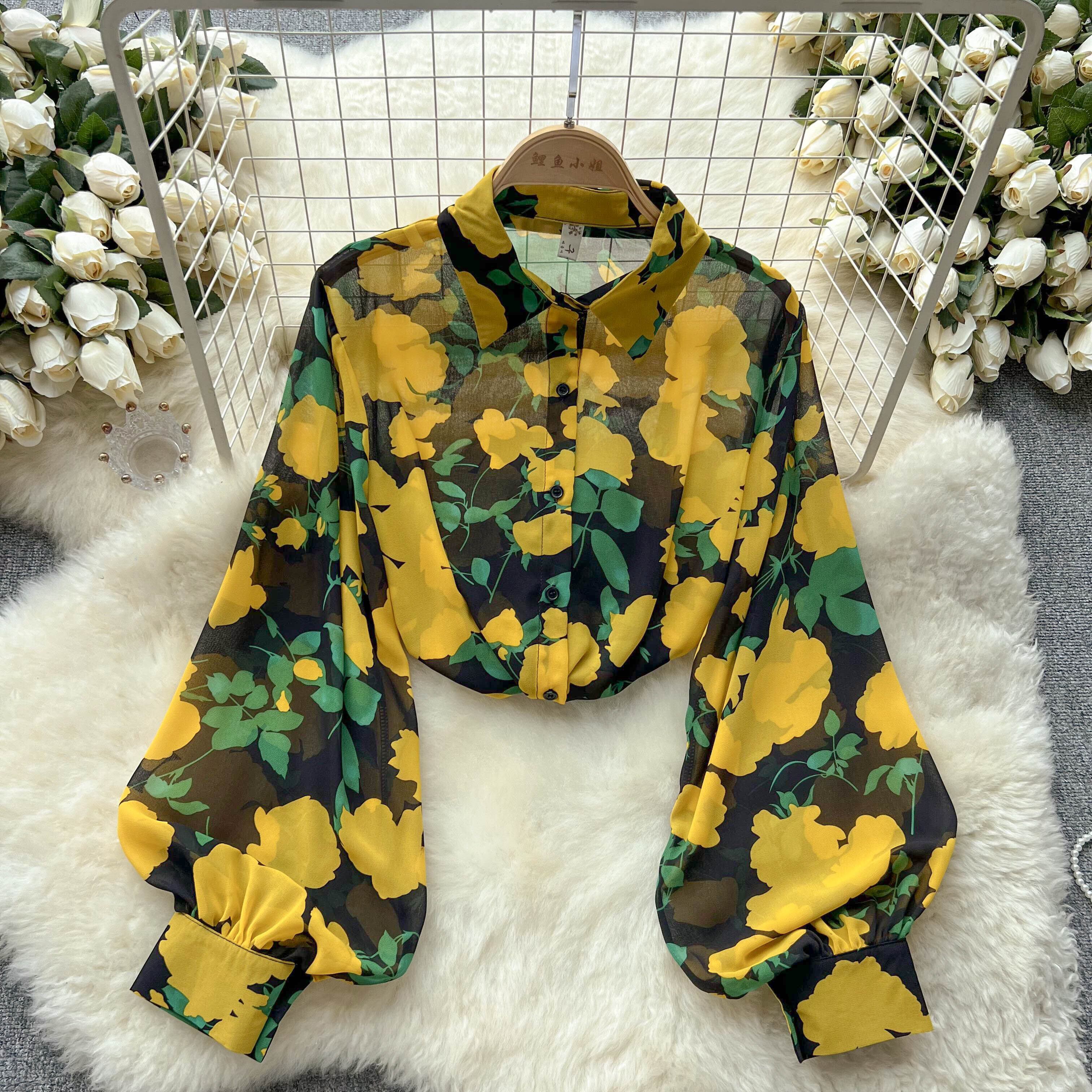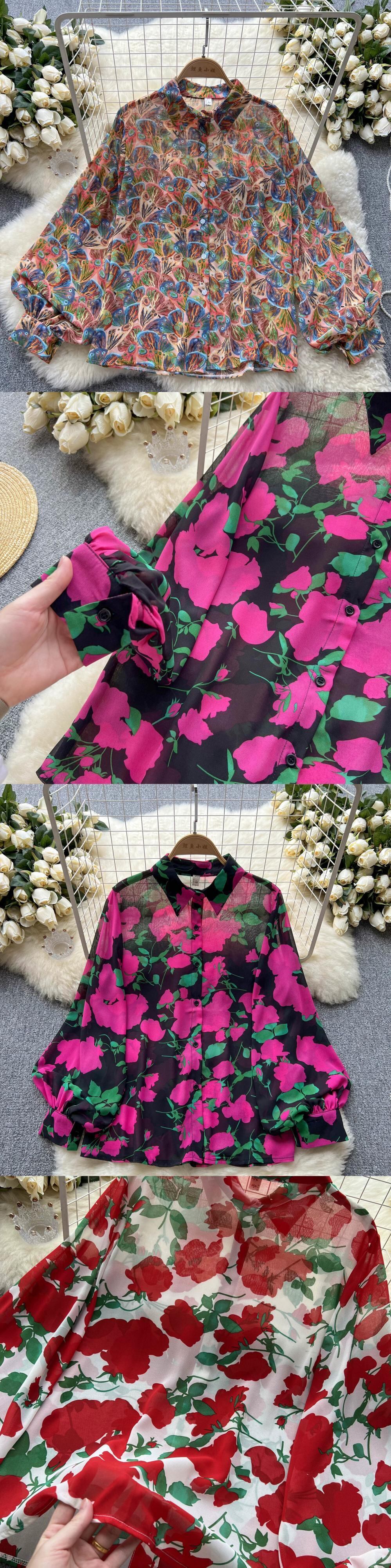 春夏の新作長袖フレンチレトロトップレディース薄手ルーズポロカラーランタンスリーブ花柄薄手シャツ ロング スプリング 春物 サマー 夏物 lyxaj9161172421