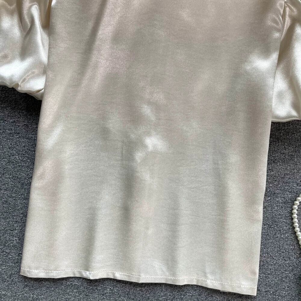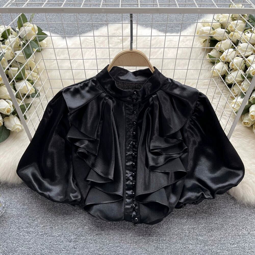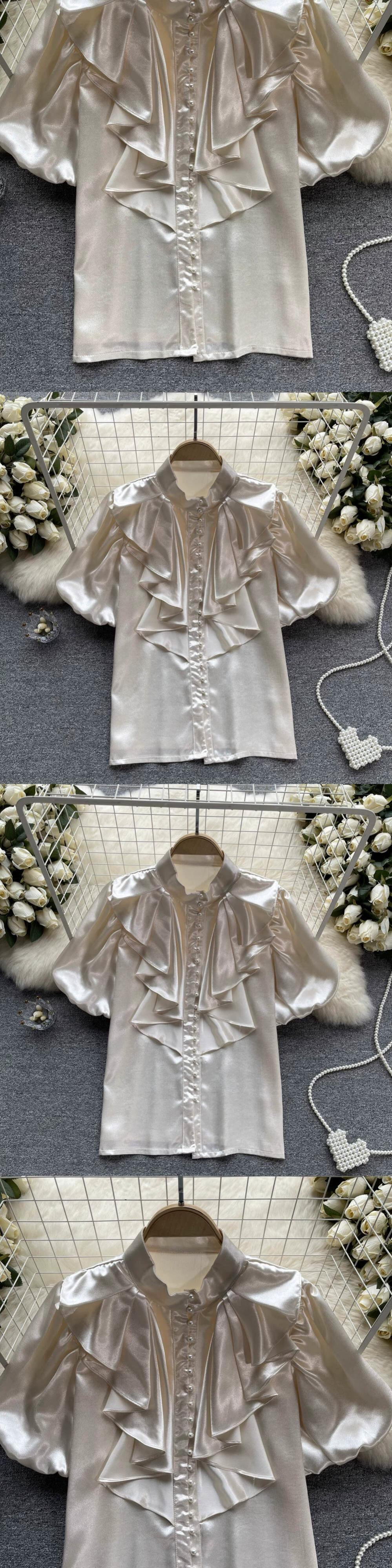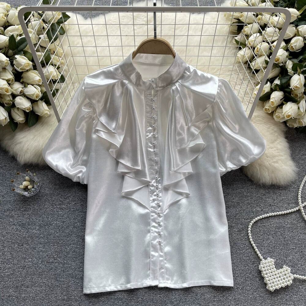 フランスの気質パフスリーブシャツレディース夏ゆったり薄手スタンドカラーサテンフリルステッチ半袖トップトレンディ サマー 夏物 lyxaj4649132412