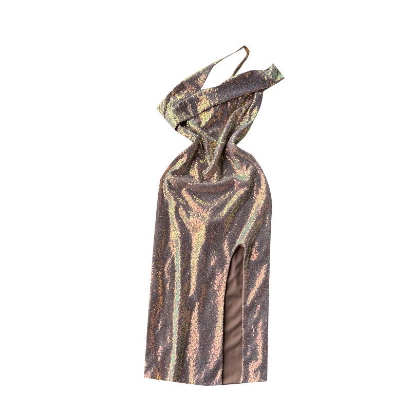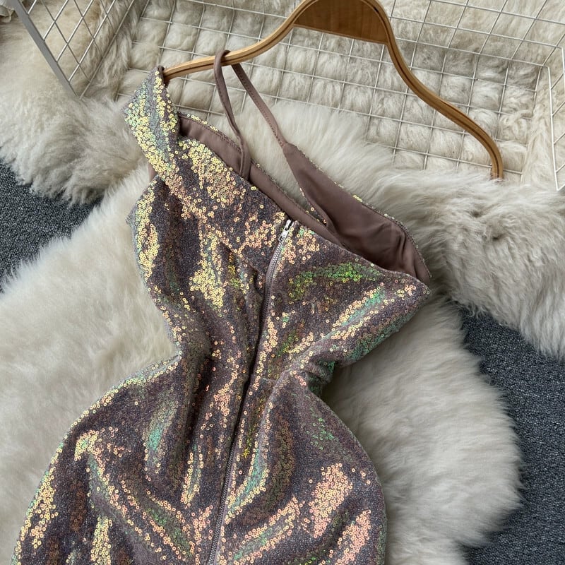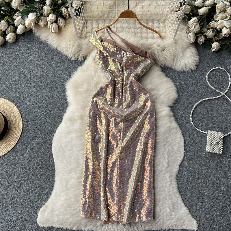 インスーパーシーサイドバケーションセクシーなスプリットウエストウエスト痩身スパンコール輝く不規則なサスペンダードレス女性の夏 サマー 夏物 lyxaj15304821723