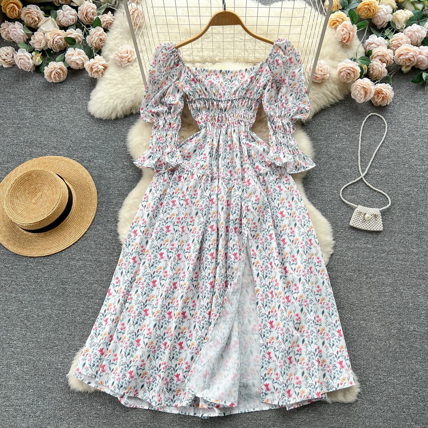 フランスの気質背中の開いた花柄ドレス女性ウエストウエスト夏旅行休暇ロングパフスリーブ妖精ドレス サマー 夏物 lyxaj49644364533