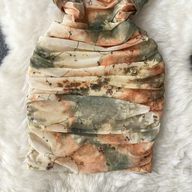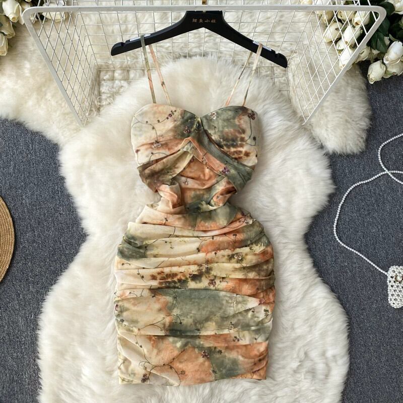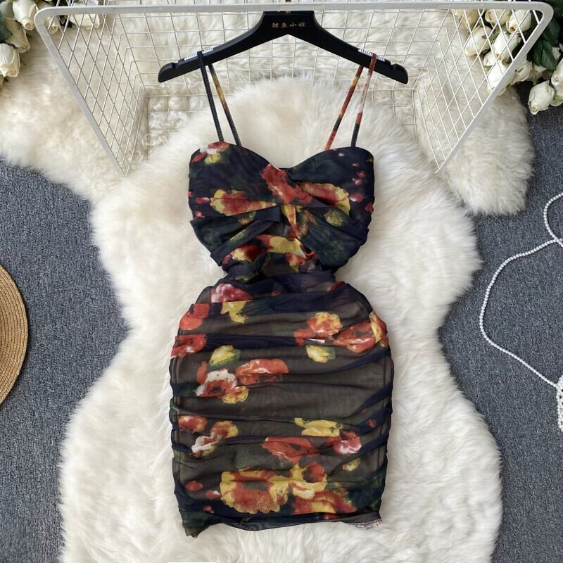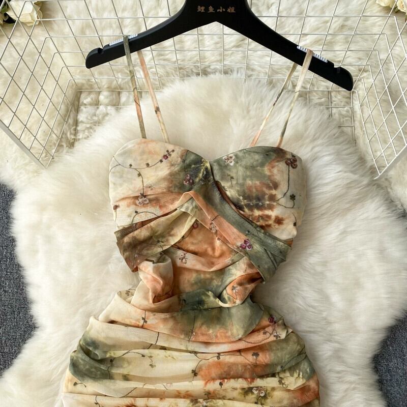 メッシュプリーツチューブトップ花サスペンダースカート女性の夏のレトロセレブウエスト痩身ヒップセクシーなドレス サマー 夏物 花柄 lyxaj50615983533