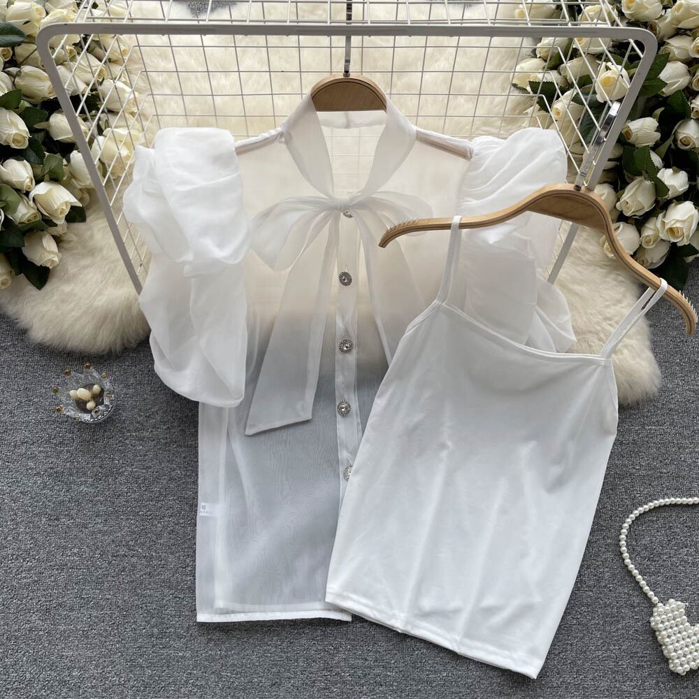 甘いオーガンザシースルーパフスリーブシャツレディース夏フレンチリボンニッチ気質スーパーフェアリーシフォントップ 大人ガーリー スウィート キュート カジュアル サマー 夏物 lyxaj19215980583