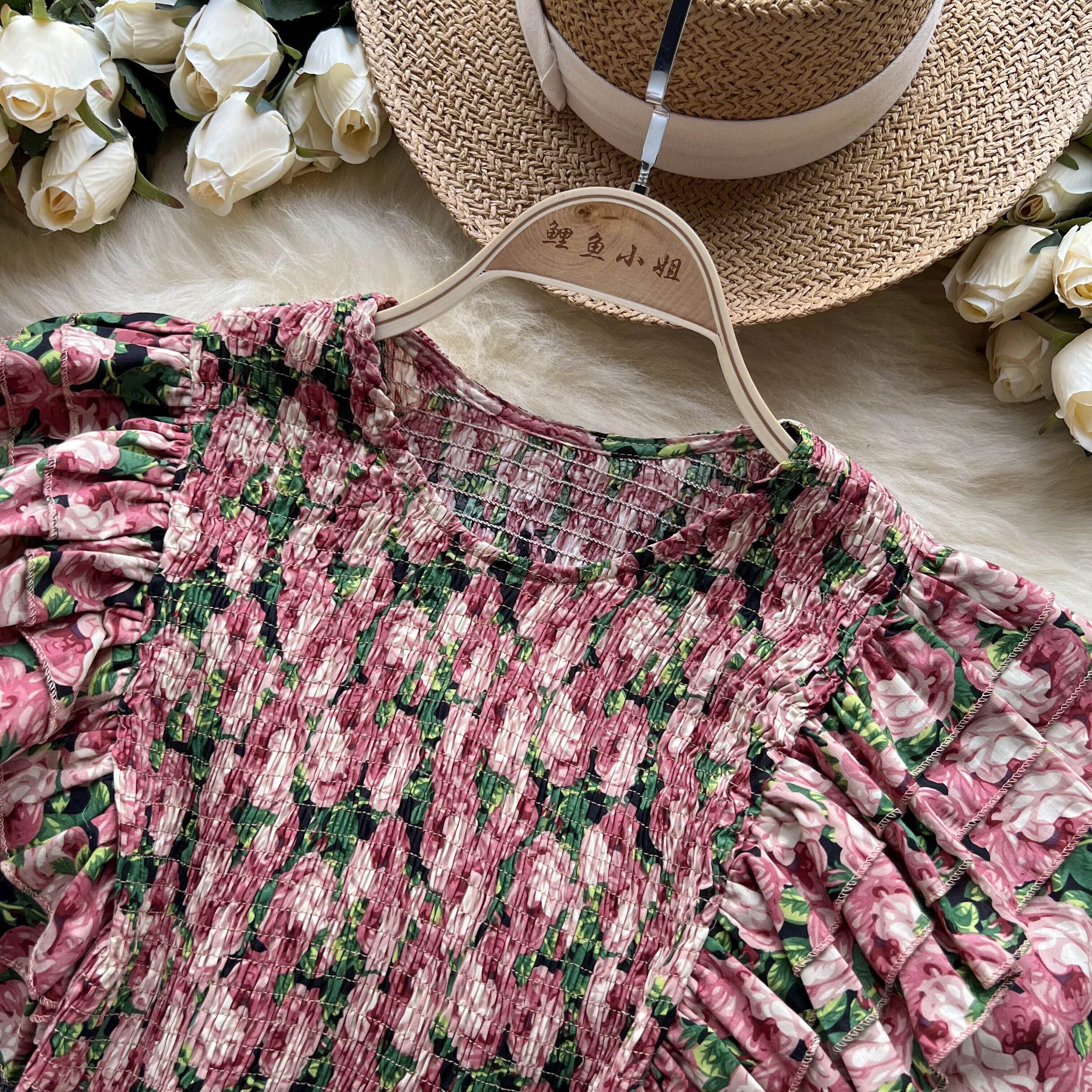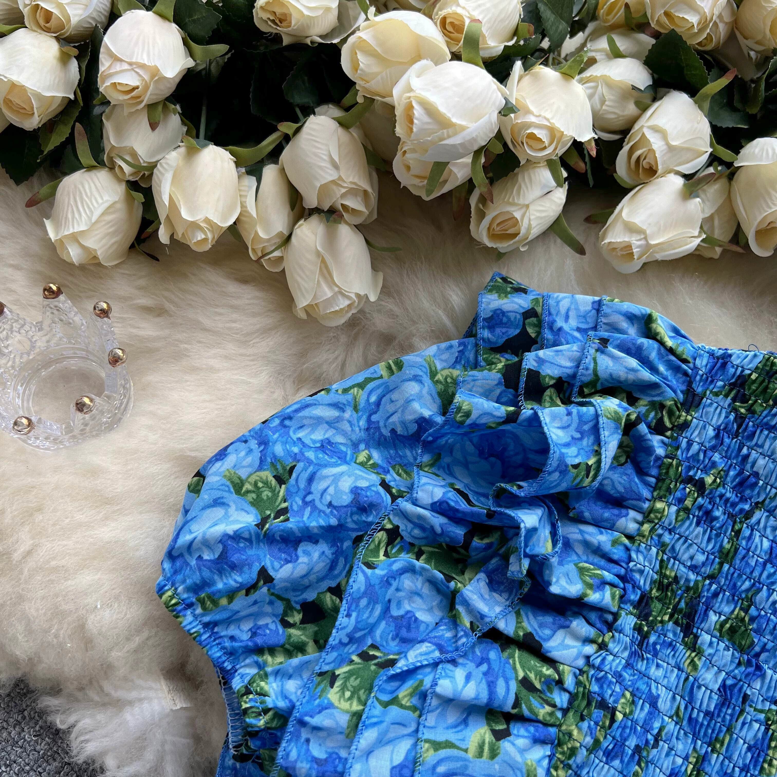 ドーパミン甘い風花柄トップ女性の夏フレンチプリーツ木耳デザインパフスリーブスリムフィットシャツ 大人ガーリー スウィート キュート カジュアル サマー 夏物 lyxaj95834539582