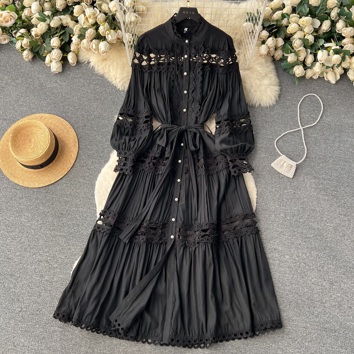 フレンチレトロ宮廷スタイルスタンドアップカラー中空シングルブレスト長袖ドレスタイウエストエレガントなハイエンドドレス ロング lyxaj67454894185