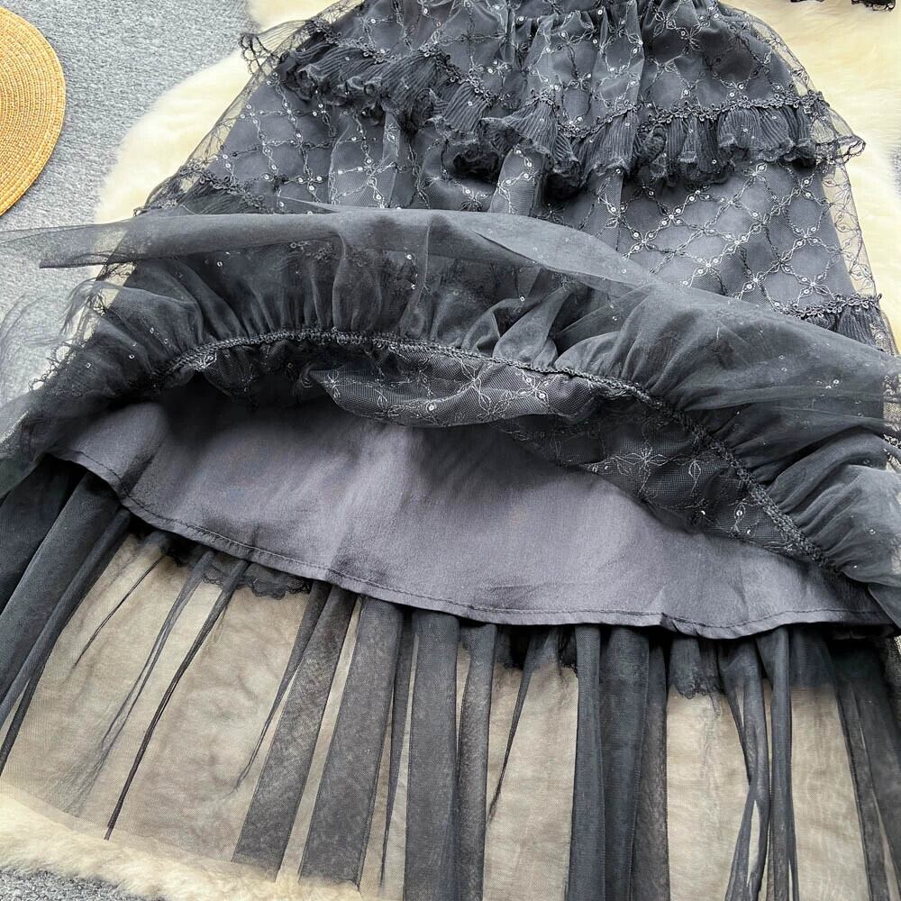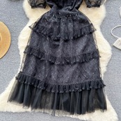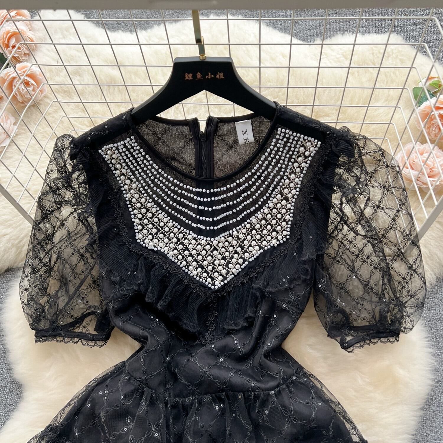 フレンチレトロヘップバーンスタイルパフスリーブレースケーキスカート夏の気質メッシュビーズスパンコールウエストドレス サマー 夏物 lyxaj75522537136