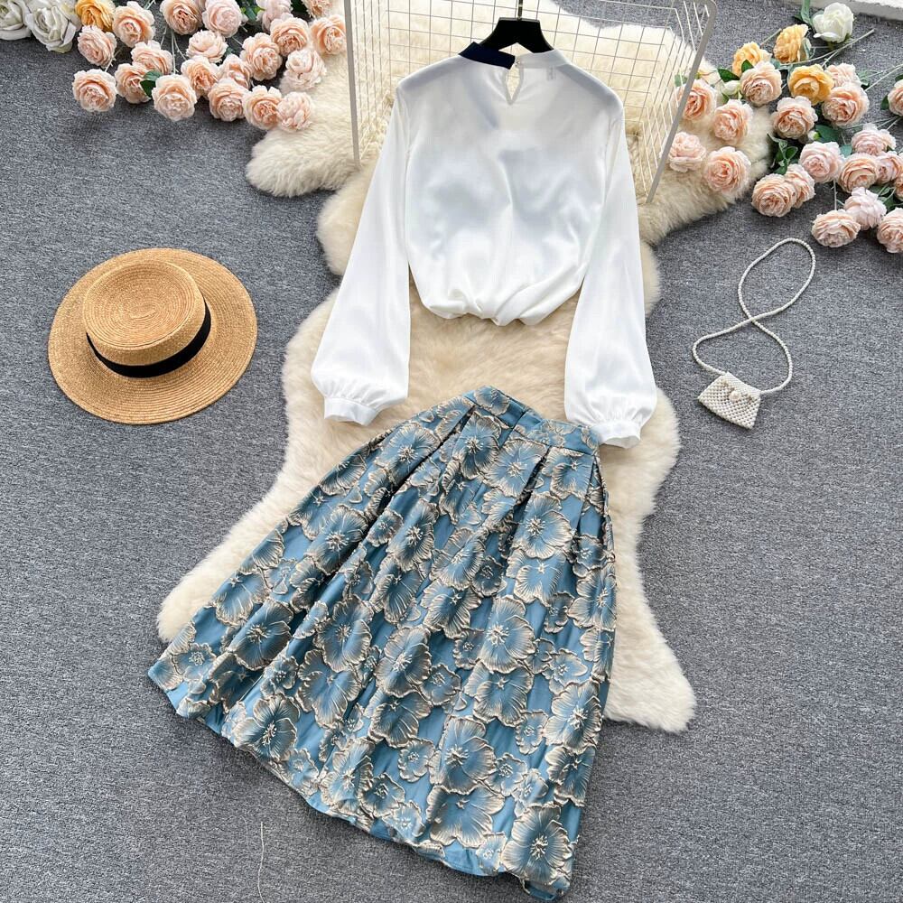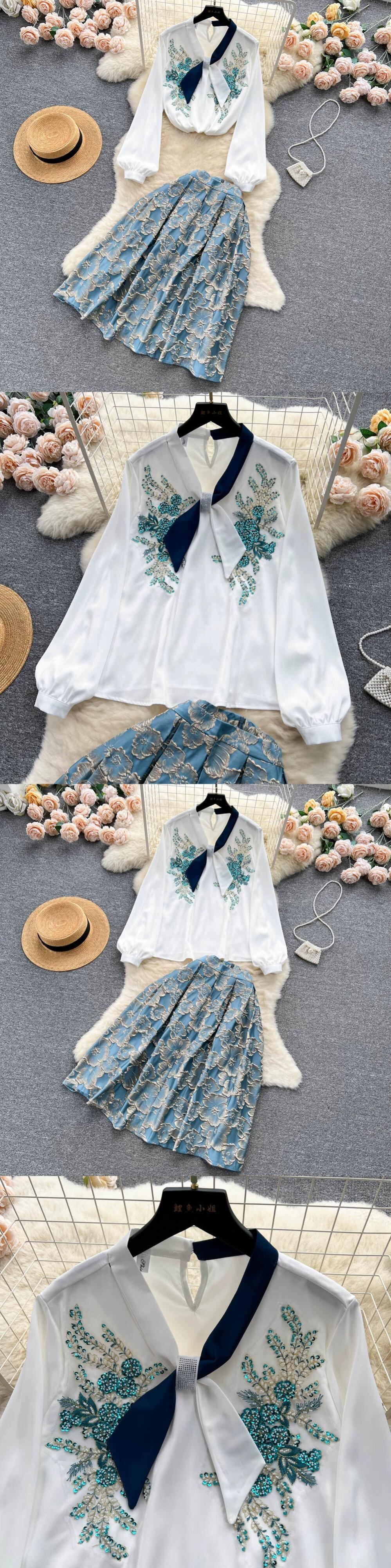 ヨーロッパスタイルの高級レトロスーツの女性の春夏の重工業刺繍ランタンスリーブシャツトップ + ウエストスカート スプリング 春物 サマー 夏物 ヨーロピアン lyxaj73646918922