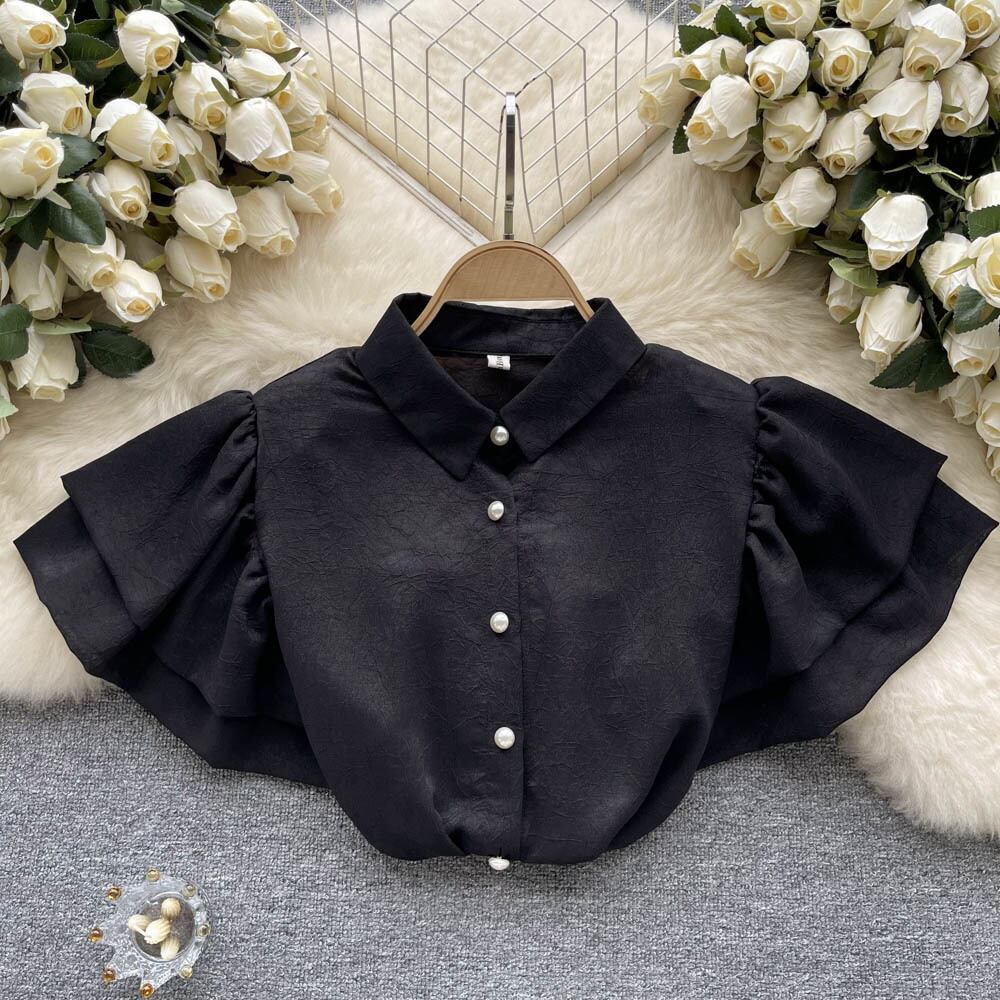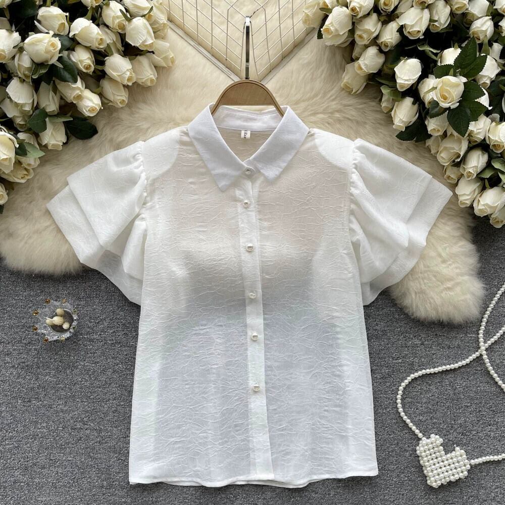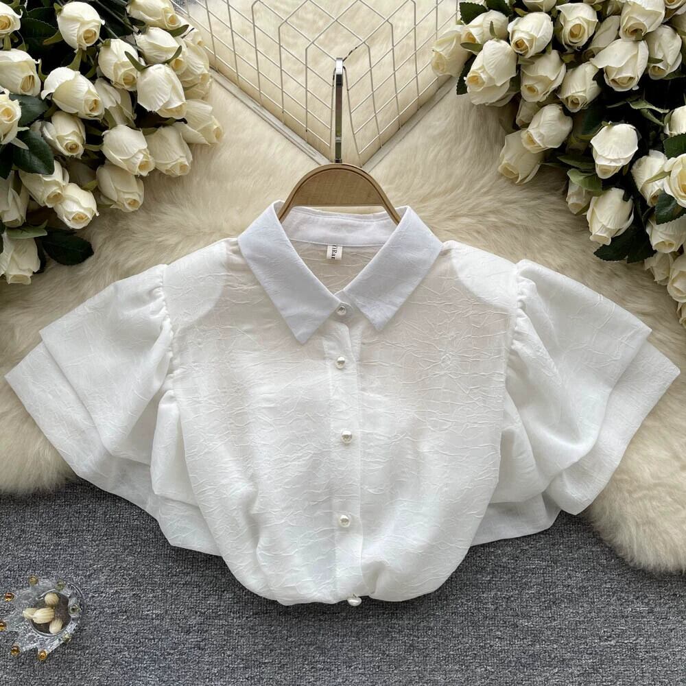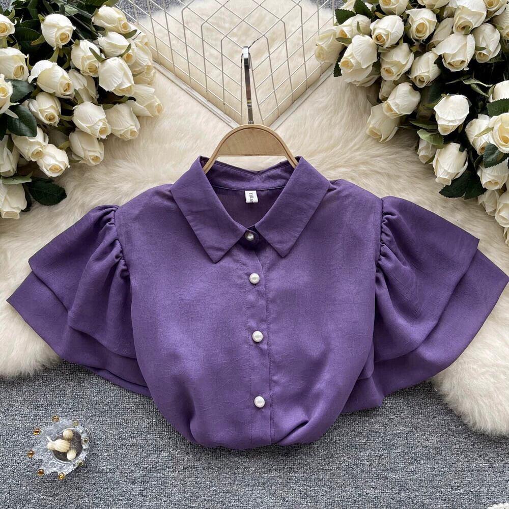 テクスチャードシックトップ女性の夏の新しい ese ポロカラーパフスリーブライト高級ハイエンドニッチシャツ レッド サマー 夏物 lyxaj27011581653