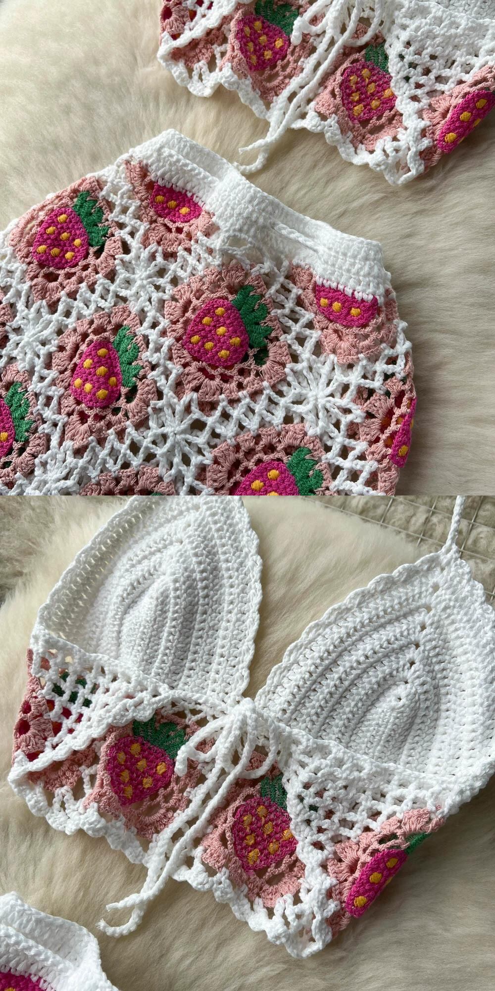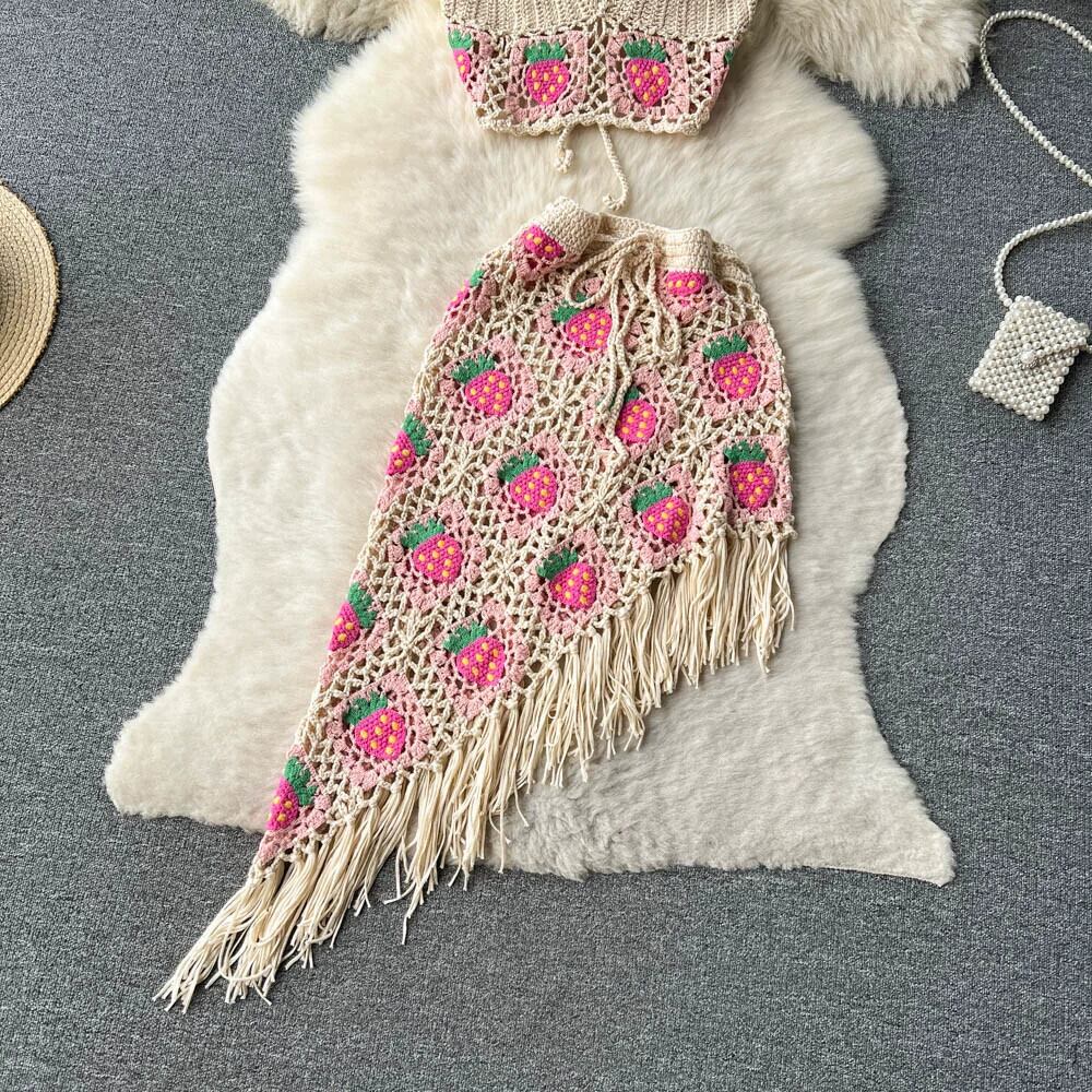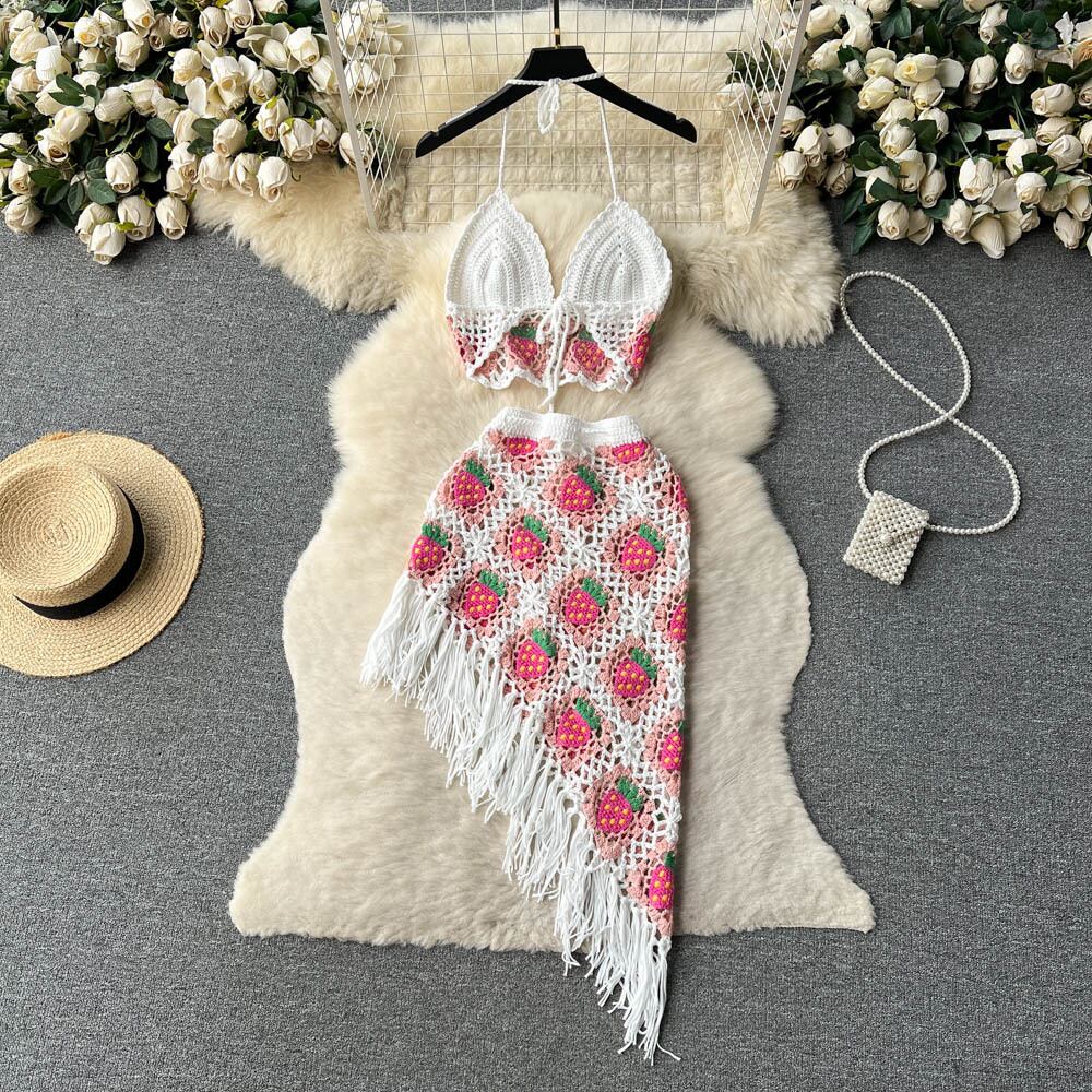 フレンチ甘辛ホリデースタイルニット中空イチゴかぎ針編みホルタートップイレギュラーハイウエストスカート2点セット ハイウェスト 大人ガーリー スウィート キュート カジュアル lyxaj76765162226