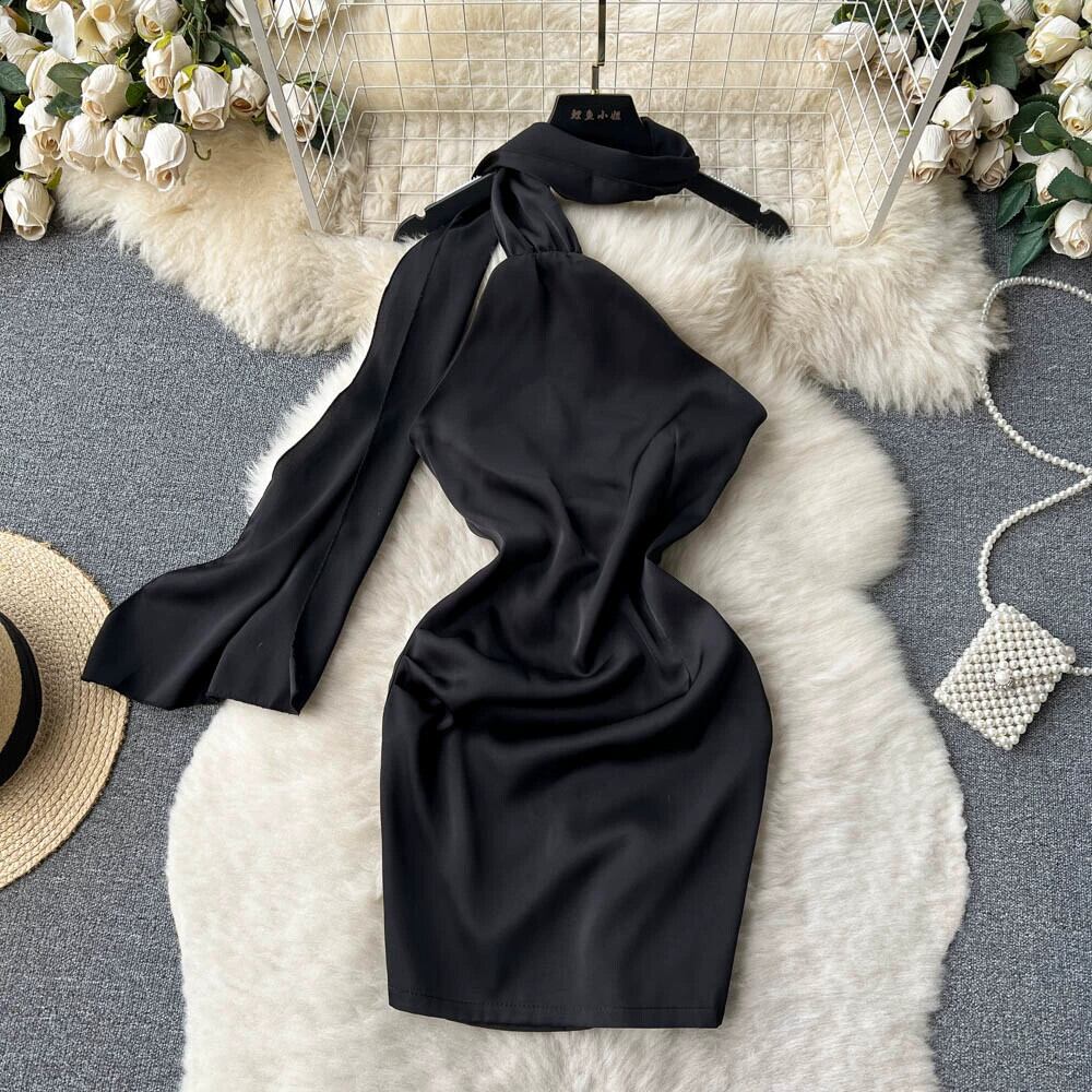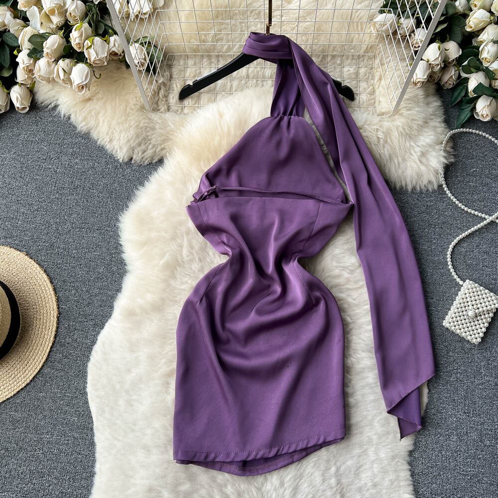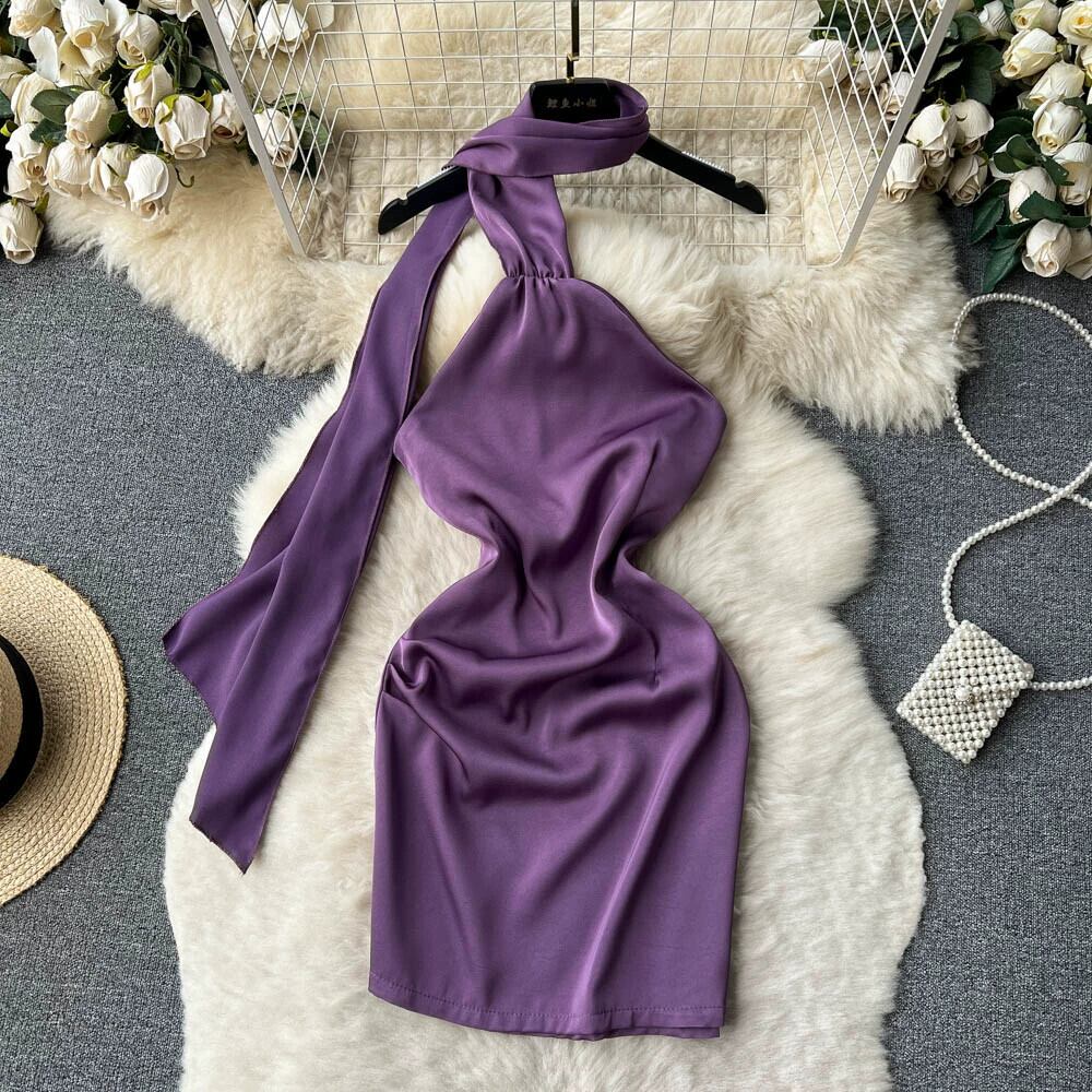 フランスの女性のハイエンドセンスストリーマーホルターネックサテンドレス女性スリムウエスト純粋な欲望風セクシーなパッケージヒップスカート ピュア lyxaj46212233394