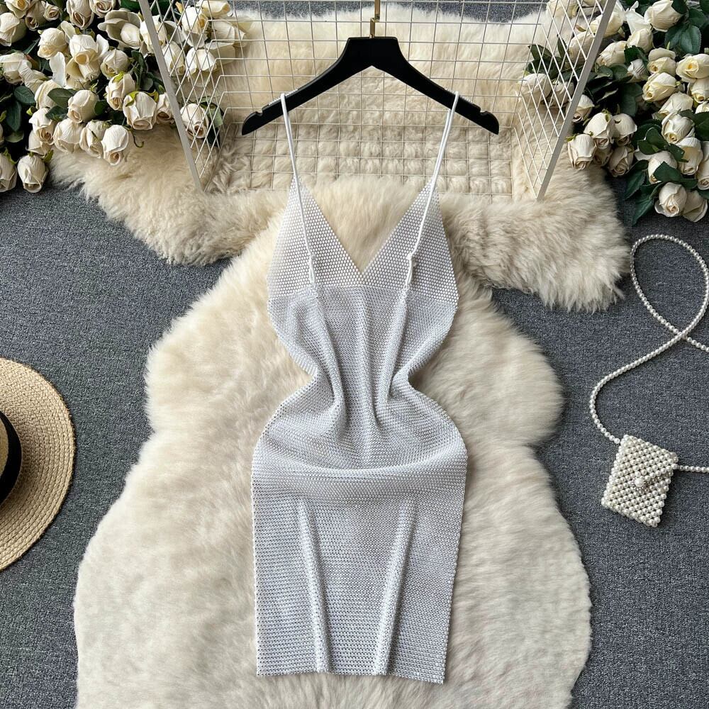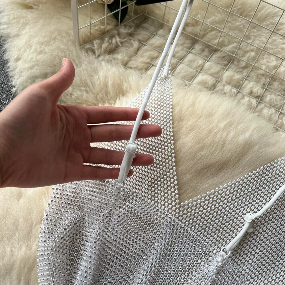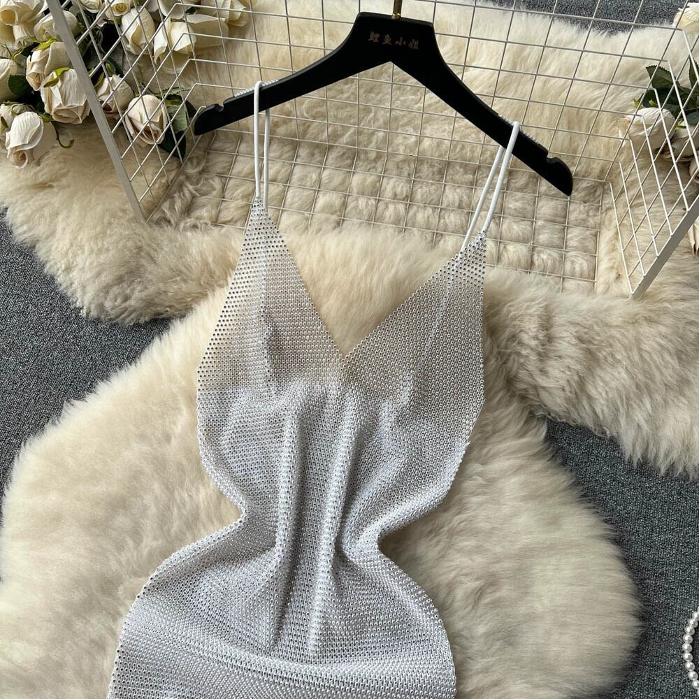 - エンドライト高級サスペンダースカート女性の夏のディープ V ネック明るいダイヤモンド中空デザインのセクシーなバッグヒップドレス サマー 夏物 Vネック lyxaj40203696418