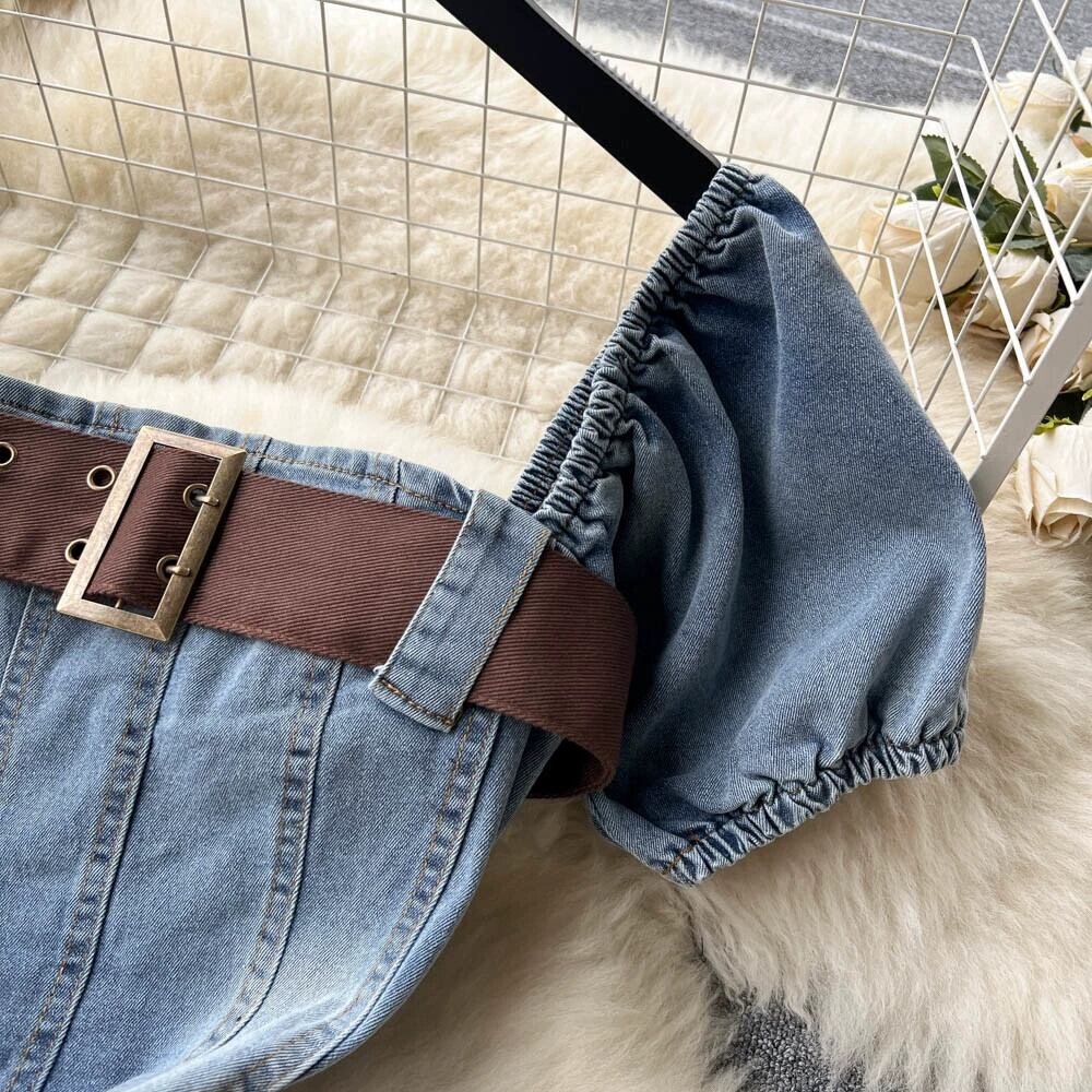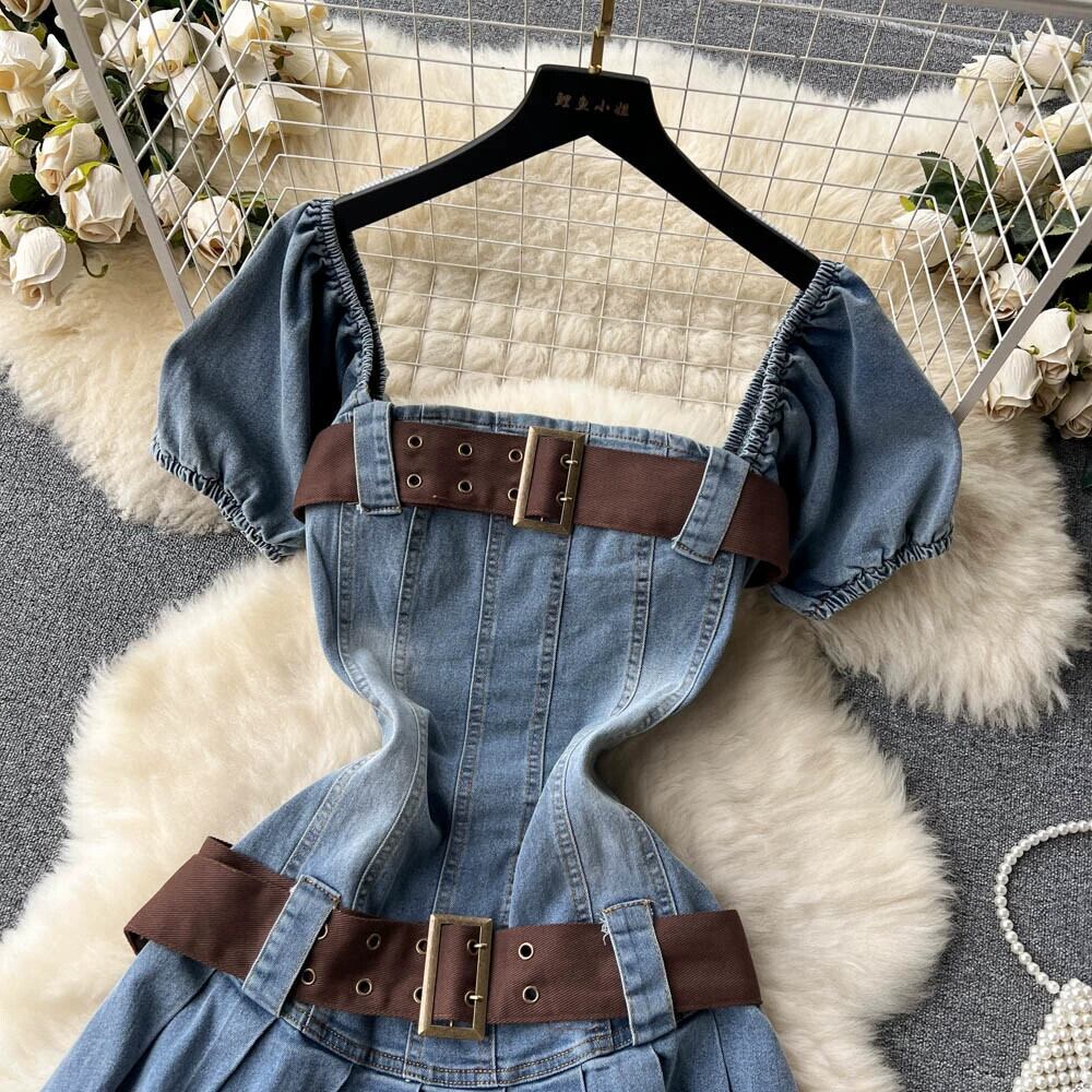 スパイスガールレトロ取り外し可能なベルトデニムプリーツデニムドレス女性の夏スリム薄型パフスリーブスカート サマー 夏物 ハーネス lyxaj64688095791