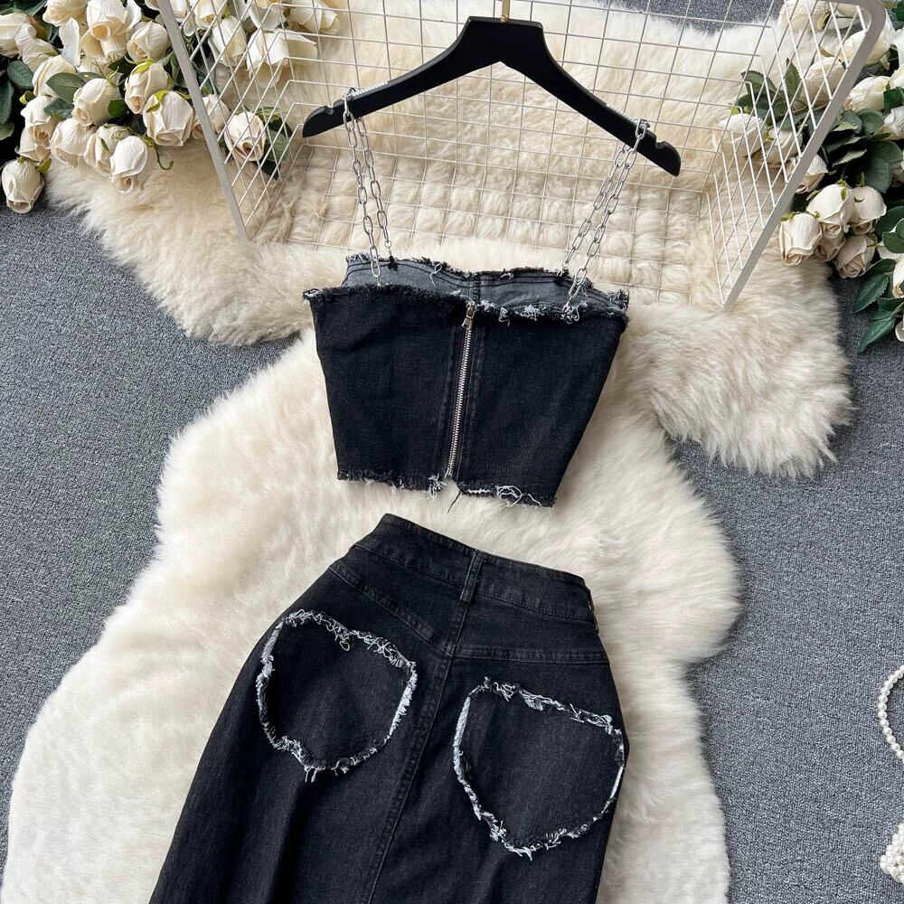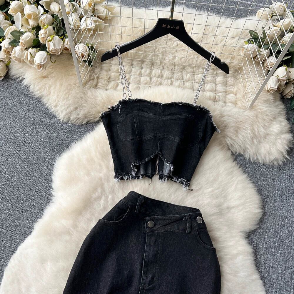 甘辛レトロローエッジデニムスーツ レディース ショートチェーンキャミソール スリットウエストスカート 2点セット 大人ガーリー スウィート キュート カジュアル lyxaj26352956270