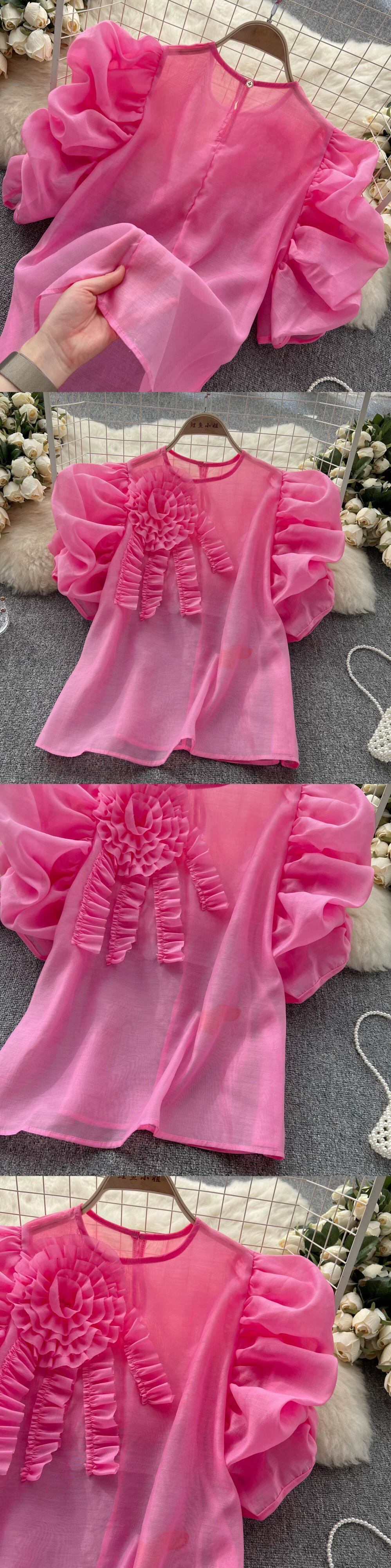 フレンチスイート立体フラワープリーツパフスリーブトップレディース夏薄部ラウンドネックルーズオールマッチシースルーシャツ 大人ガーリー スウィート キュート カジュアル サマー 夏物 Oネック フラワーデザイン lyxaj77635459175