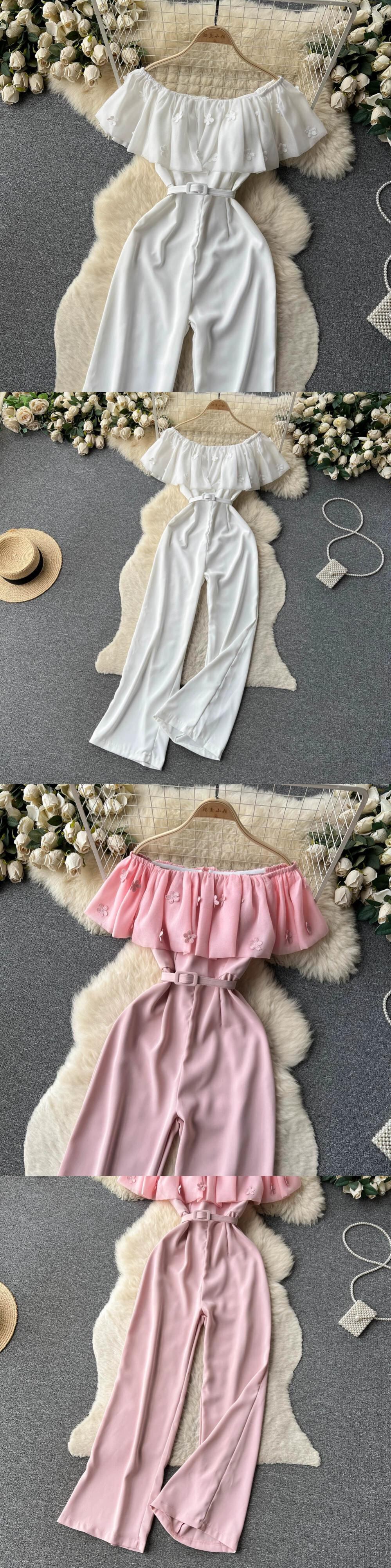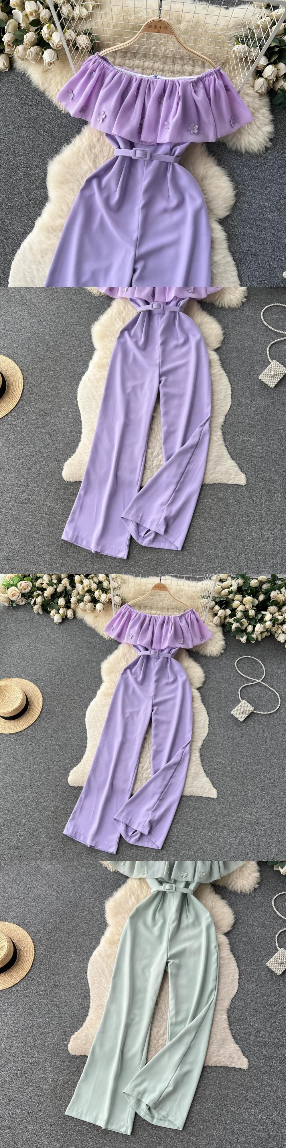 フレンチライトラグジュアリースタイルワンピースジャンプスーツレディース夏フリルウエスト痩身ワイドレッグストレートロングパンツ サマー 夏物 lyxaj17356029357