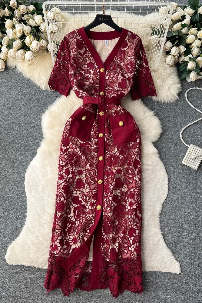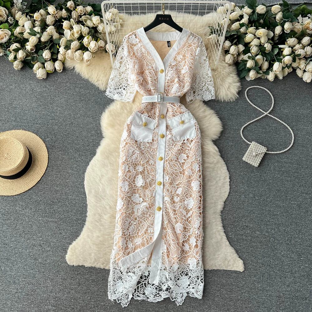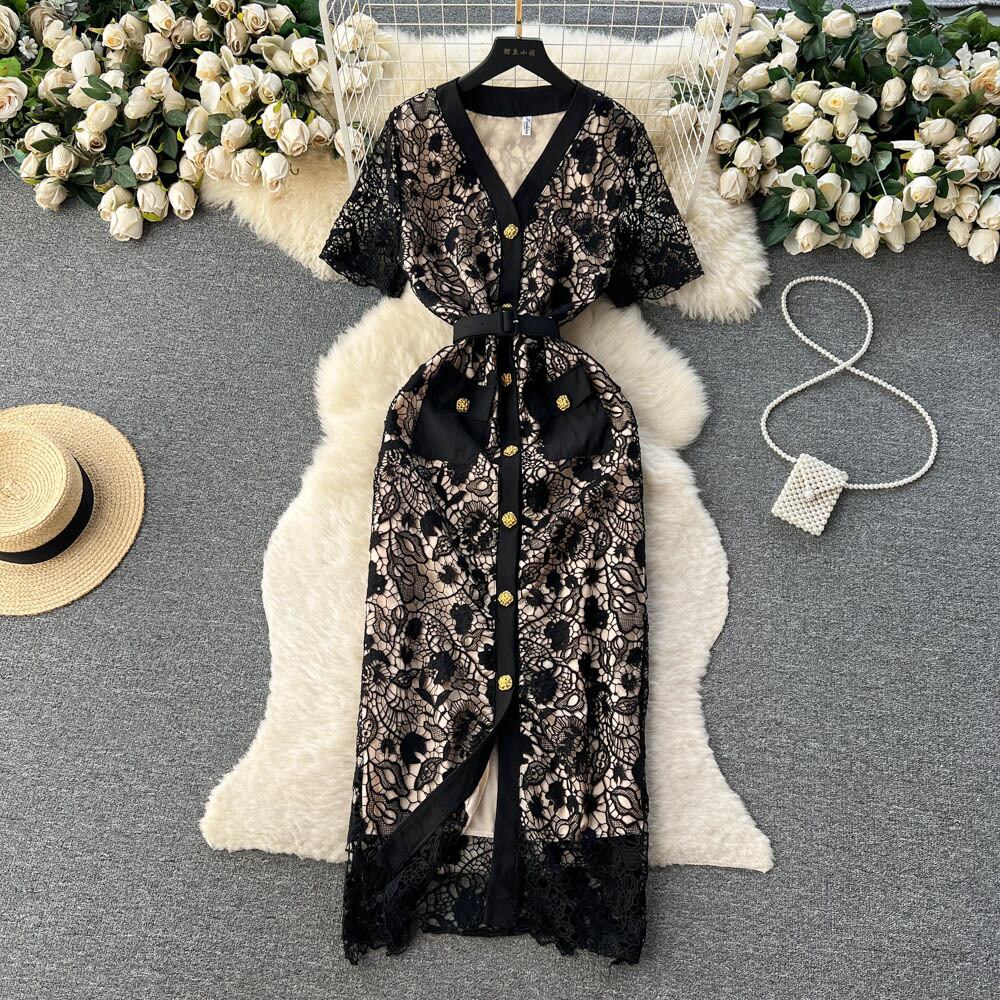 フランスの気質の軽くて馴染みのある風ドレスの女性の夏のシングルブレストウエスト半袖レース中空セクシーなロイヤルシスターロングスカート サマー 夏物 lyxaj66098348814