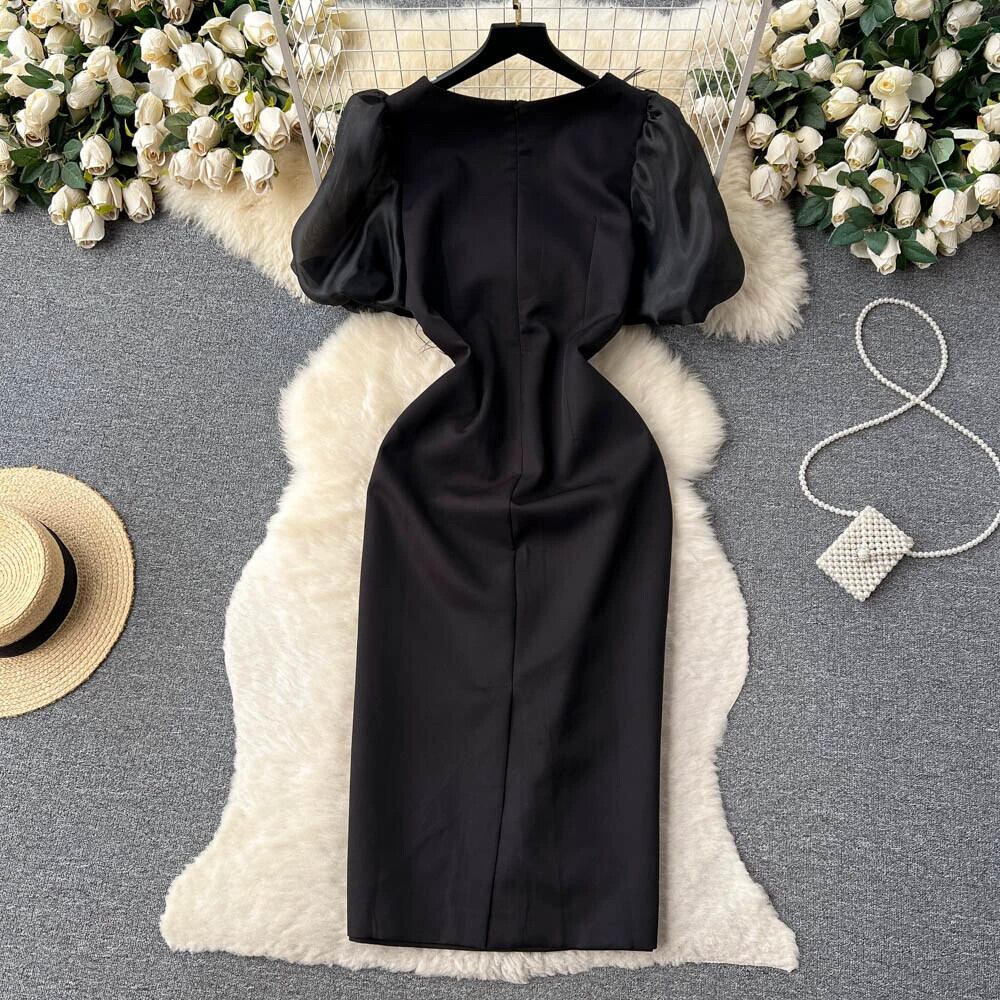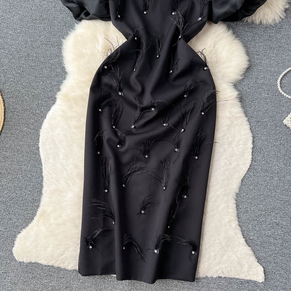 ライトラグジュアリーレディーススタイルドレスレディースサマーパフスリーブビーズフェザーデザインスリット感スリムフィットニッチスカート 夏物 lyxaj72338131035