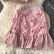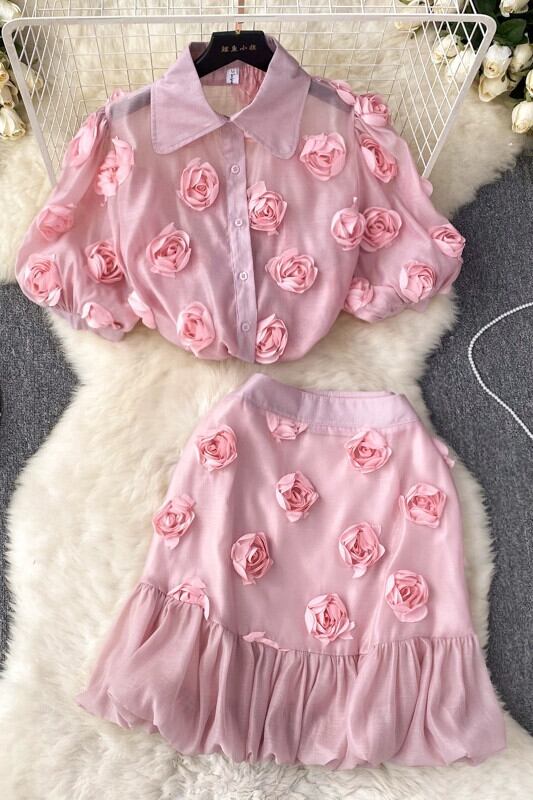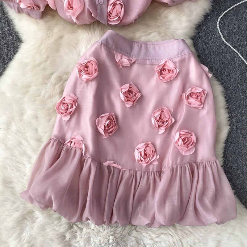 フレンチレトロロマンチックなスタイルのスーツの女性の夏の立体的な花のポロカラーシャツパフスリーブトップ+ふわふわスカート サマー 夏物 フラワーデザイン lyxaj91490733942
