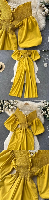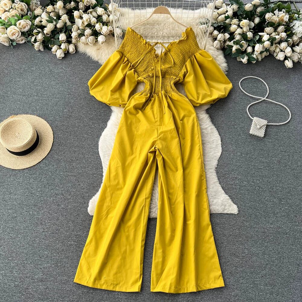 フレンチバケーションスタイルウッドイヤーサイドジャンプスーツレディースサマーVネックプリーツパフスリーブウエストスリムワイドレッグストレートパンツ 夏物 lyxaj67916102544