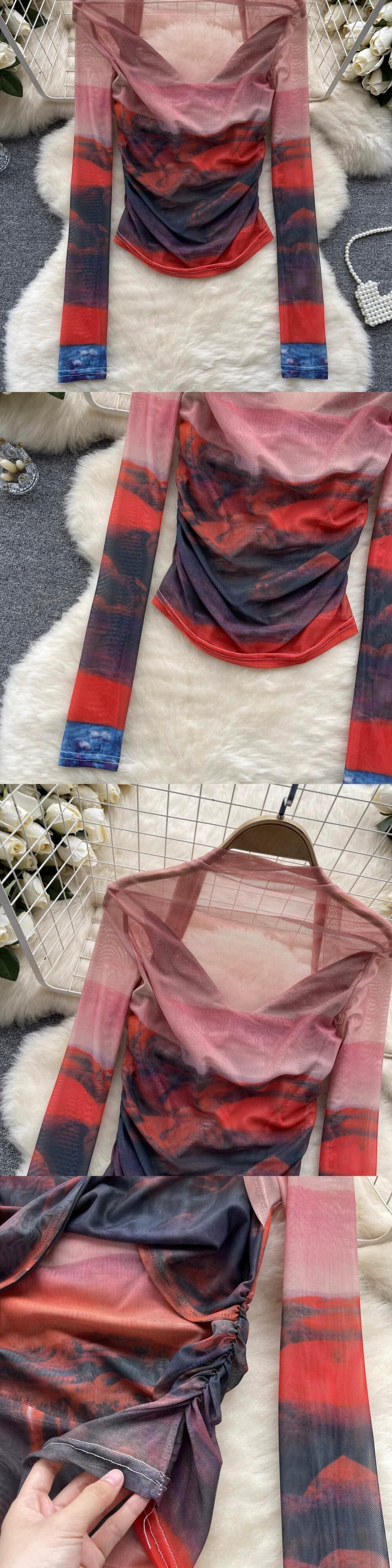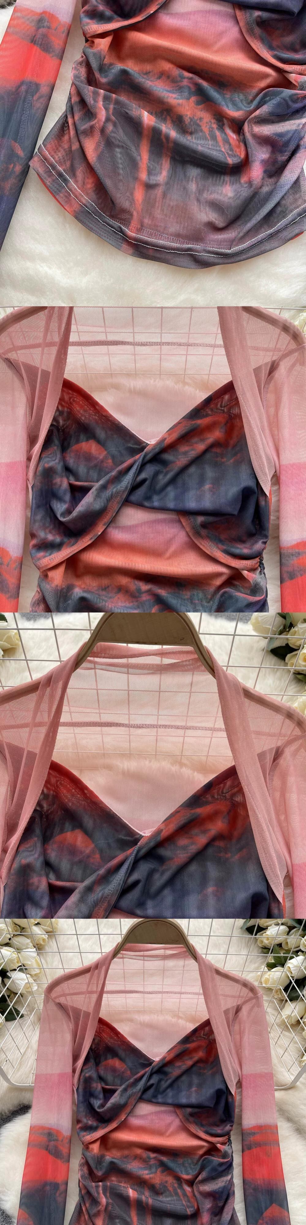 アメリカの絞り染めメッシュボトリングシャツ Tシャツ女性の夏の薄いセクション視点気質ファッションスリムプリーツトップ サマー 夏物 lyxaj24599733945