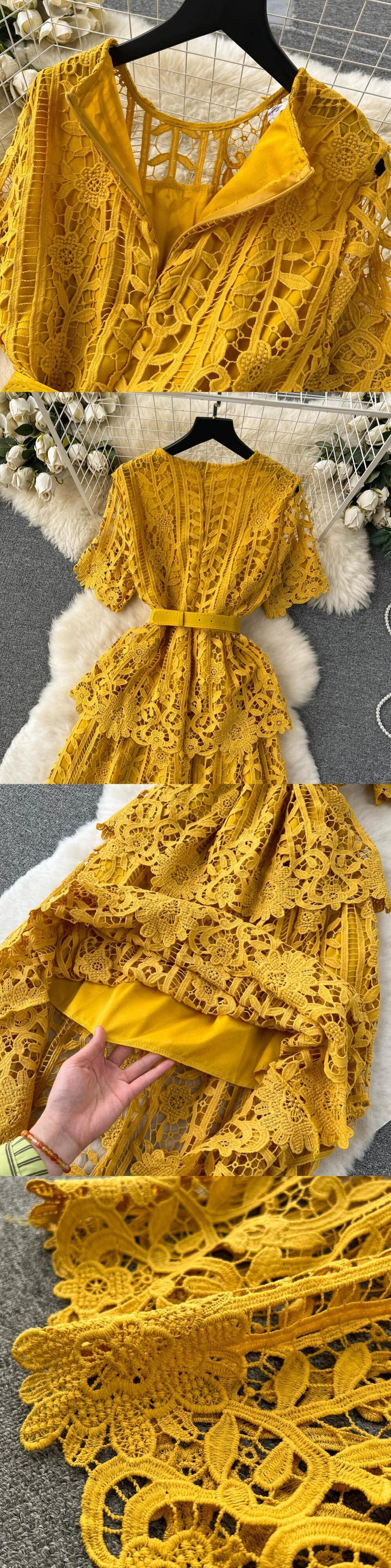 フランスのハイエンド中空フックフラワーレース半袖ドレス女性のウエスト痩身エレガントな軽い高級ロングスカート フラワーデザイン lyxaj90787965980