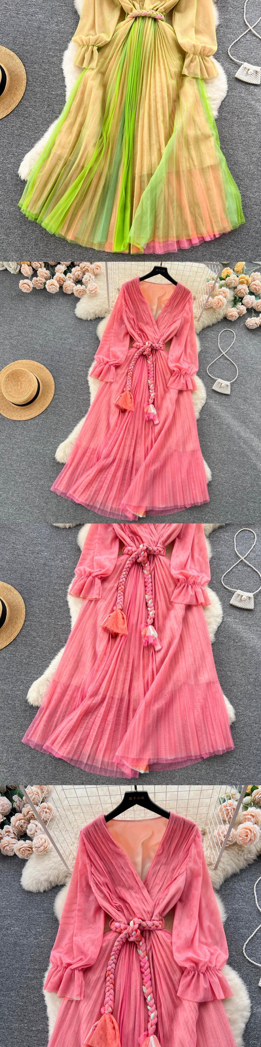 -エンドホリデースタイルドレスレディースサマーメッシュガーゼプリーツVネック花びら長袖スーパーフェアリーフレンチロングスカート 夏物 lyxaj50034795044